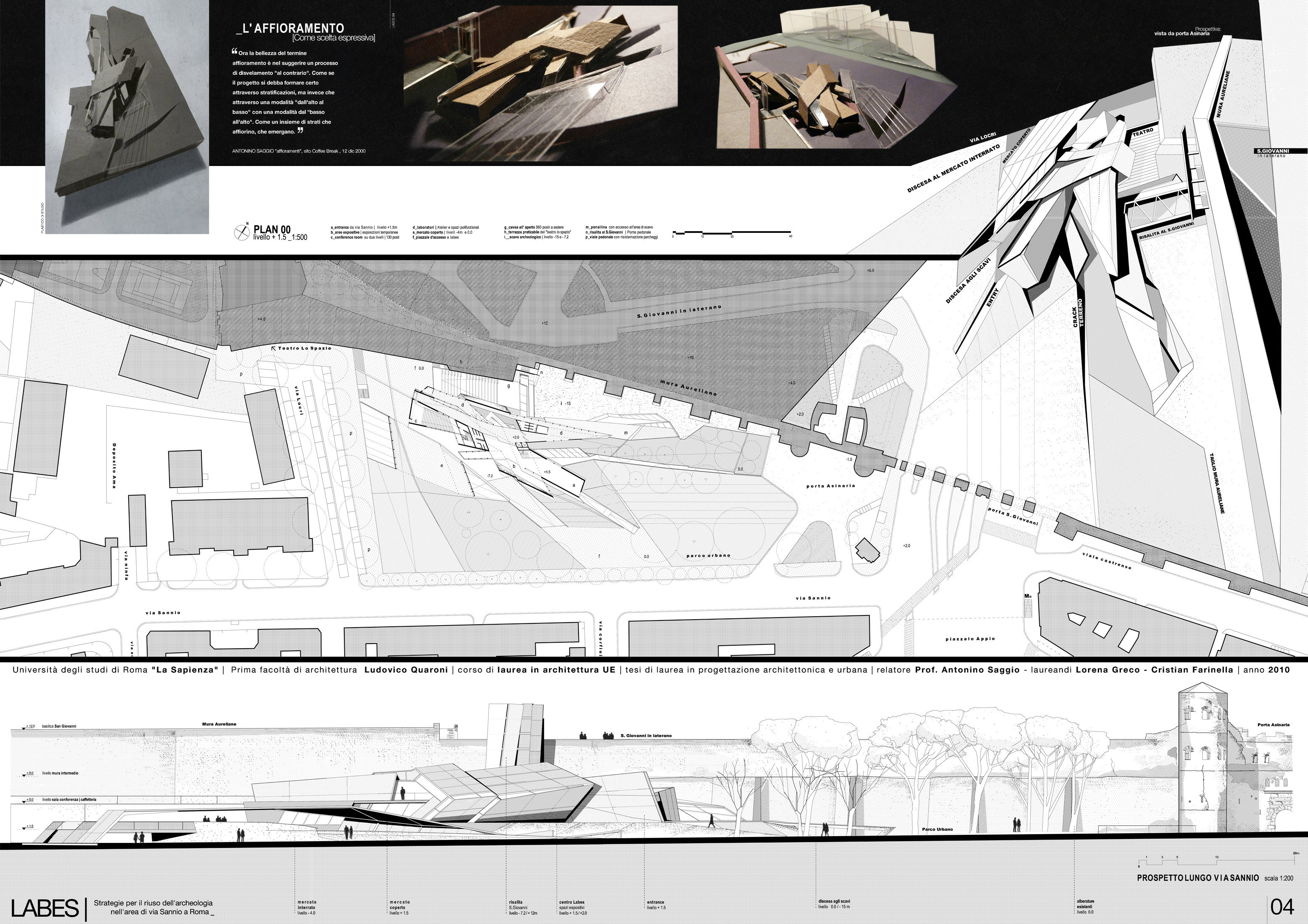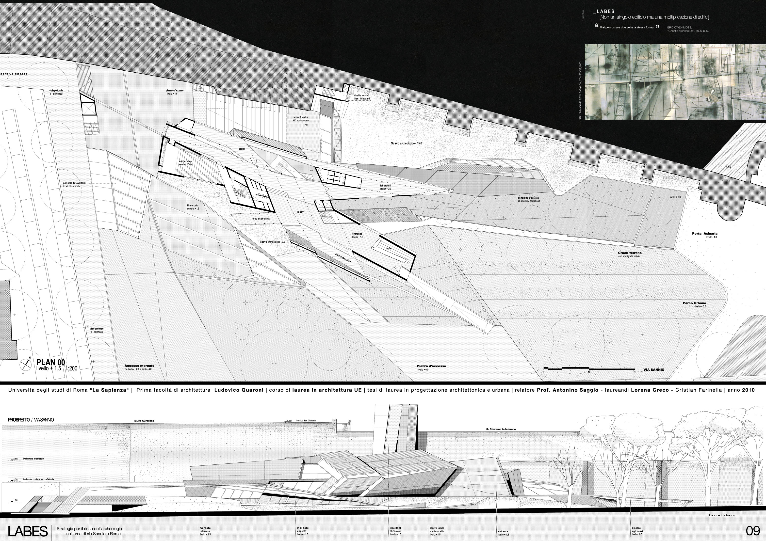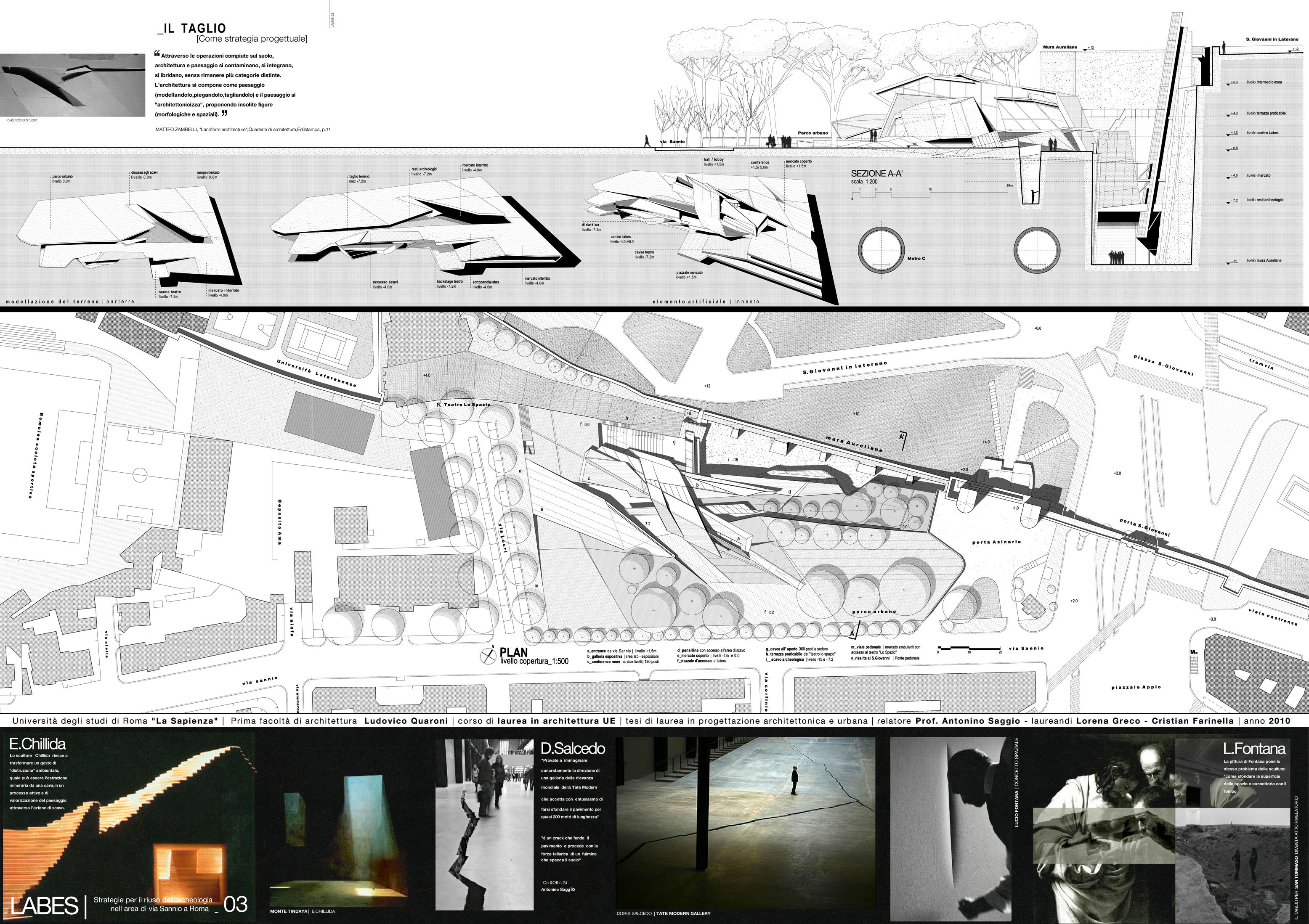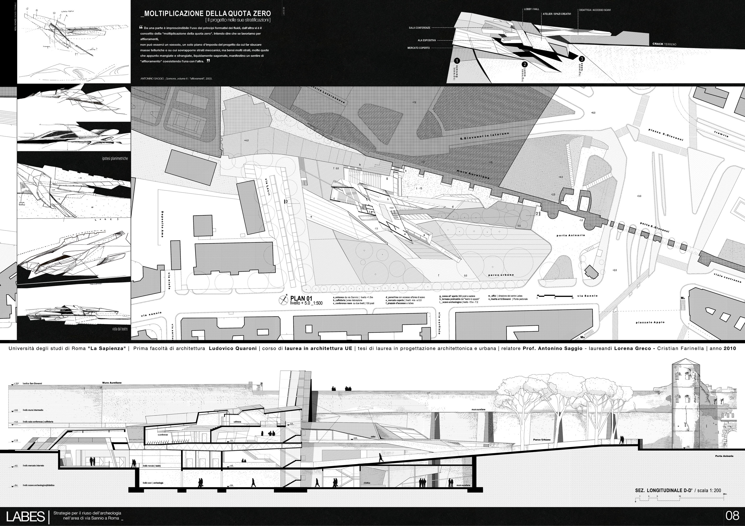 Dal punto di vista del programma d'uso, il progetto propone un misto di attività che prevedono sia la riorganizzazione del mercato di via Sannio, di cui da molti anni si chiede una messa a norma anche dal punto di vidta degli impianti e della sicurezza, una serie articolata di ambienti commerciali, una zona culturale ed educativa ed una per lo sviluppo attivo dell'archeolgogia sia con ambienti per laboratori e conferenze sia attraverso percorsi che permettano di vedere oltre agli scavi ultimati anche quelli in progress che continueranno a svolgersi negli anni. Inoltre la presenza nell'area di via Sannio di un teatro sperimentale, dà l'occasione concreta di sviluppare anche una zona del progetto a questo scopo. Alla via “dell’oblio archeologico”, a cui tante e tante parti della nostra città i resti archeologici sono confinati, si preferisce duque quello della “memoria viva”. Memoria che qui è anche finanziata dal motore economico che questo progetto potrà innestare. Ai mega centri commericiali che erodono territorio e propongono modelli tra l'altro superati anche commercialmente, Labes sostituisce il valore della complessità funzionale, della mixitè, dell'intelligenza e della stessa specificità archeologica del progetto come forza trainante di una riorganizzazione complessiva. Dal punto di vista spaziale il progetto si articola sviluppando il tema stesso del dislivello, della sezione, dello scavo, del Labes appunto. Una serie di incisioni “chirurgiche” lungo via Sannio rivelano la presenza di resti del passato, danno accesso al nuovo progetto, scavano ancora di più lungo le Mura aurealiane ritrovando il livello archeologico e da questo ricollegano la parte bassa della via con la parte alta di piazza San Giovanni. E' una ricerca che a partire da Lucio Fontana e più di recente da Doris Salcedo mostra che attraverso l'atto della incisione si rivelano mondi e dimensioni inaspettate. Questo tema che è architettonico e funzionale ad un tempo, si sviluppa con un linguaggio dinamico e un sistema costruttivo a grandi travature metalliche che formano pareti e solai e permettono di risolvere con sicurezza le grandi complessità plastiche del progetto. |
