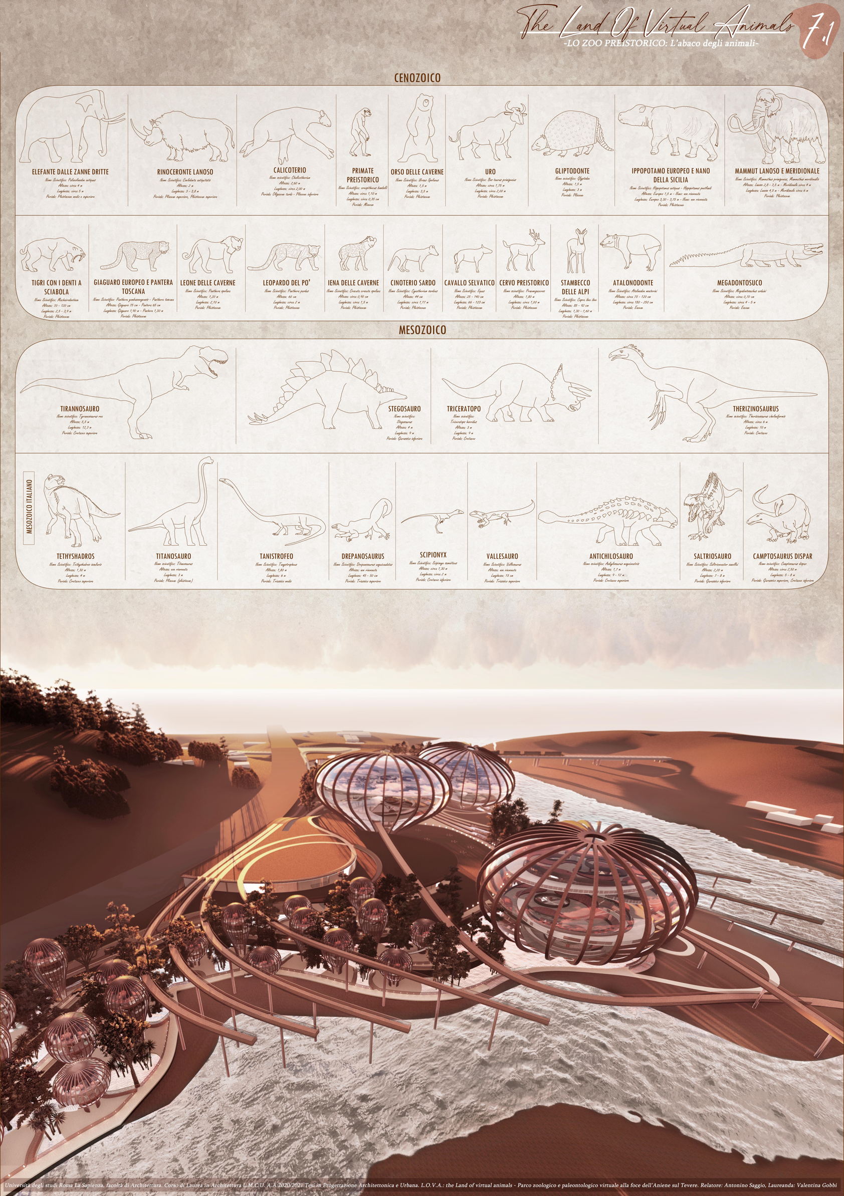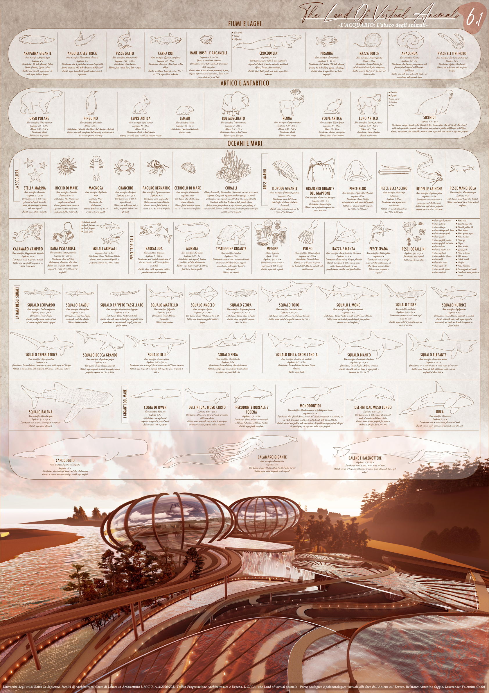 L’area di progettazione si compone in particolare di quattro edifici: lo zoo preistorico, lo zoo terrestre, l’acquario e la voliera con il giardino botanico. L’organizzazione funzionale interna è divisa in aree tematiche diverse per ogni edificio: habitat marini, continenti, biomi terrestri ed ere geologiche. Ad ognuna di queste zone corrispondono gli animali appartenenti a tali habitat con attività interattive ad essi associate.