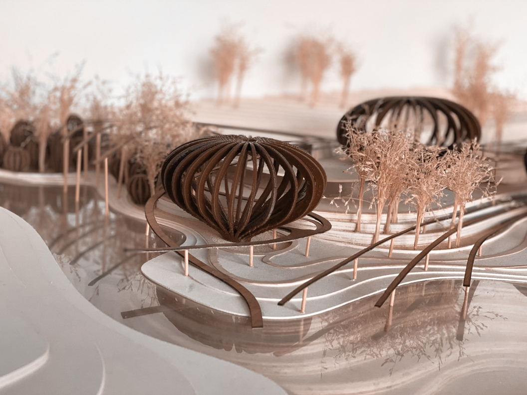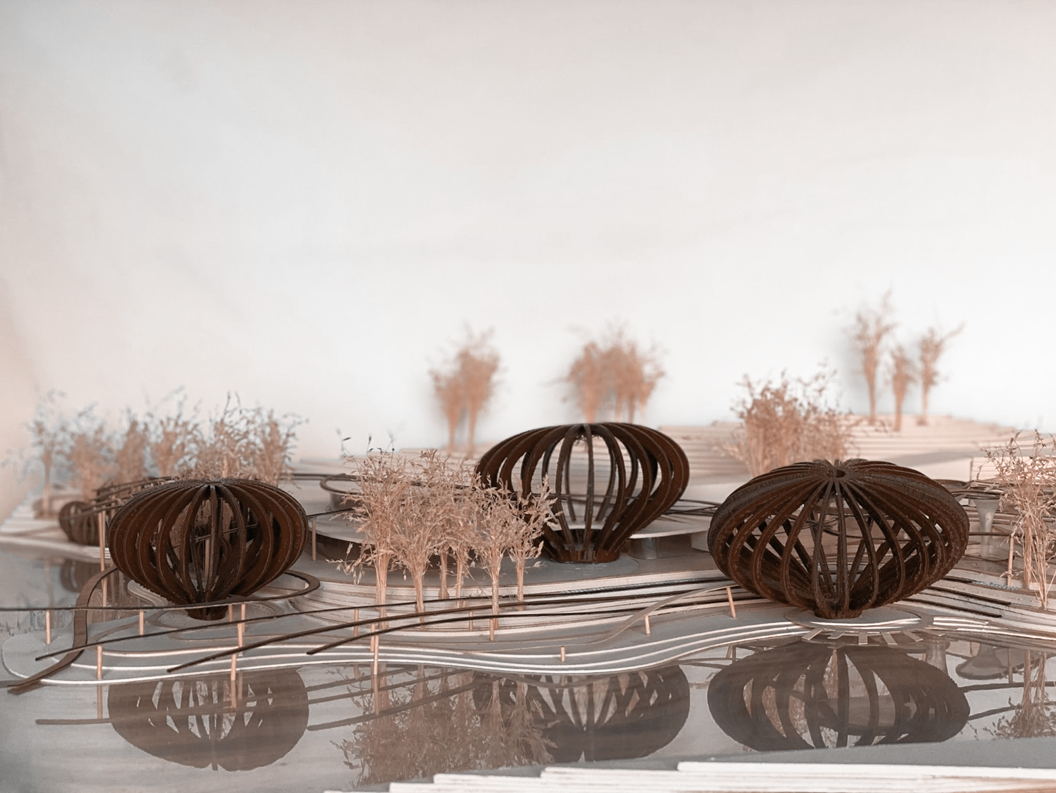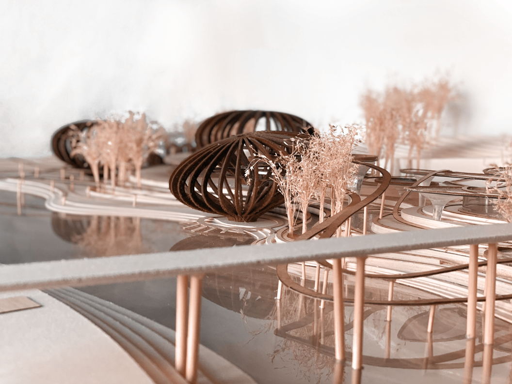 Il disegno complessivo, così ottenuto, si compone di una serie di linee virtuali che possono a questo punto trasformarsi in pieni e vuoti, percorsi a terra, percorsi sospesi, piazze, aree verdi, edifici interrati o scoperti. La morfologia del progetto rappresenta metaforicamente i reperti fossili degli animali preistorici che si sono estinti per lasciare spazio alle forme di vita attuali. Questo contrasto tra mondo antico preistorico e mondo moderno ologrammatico è uno dei dati salienti del progetto. Il progetto prende forma anche dal rapporto di dare avere che si crea tra il fiume e l’architettura e dalle particolari infrastrutture idriche adottate, fondamentali anche come risoluzione delle importanti emergenze idriche che riguardano l’area.