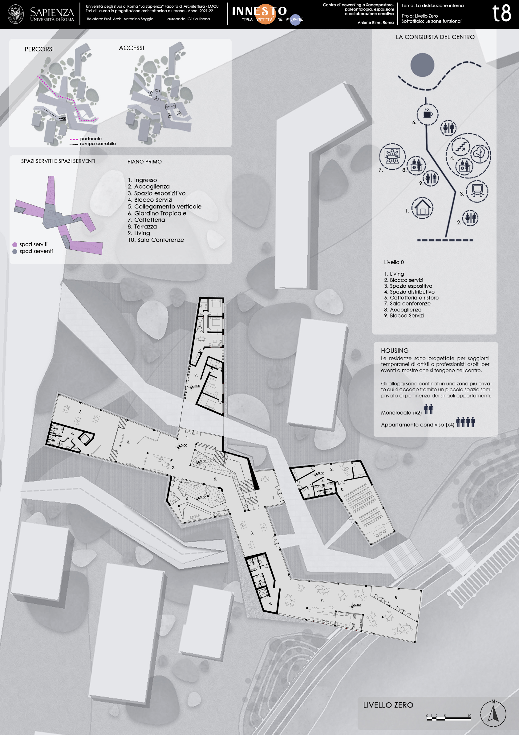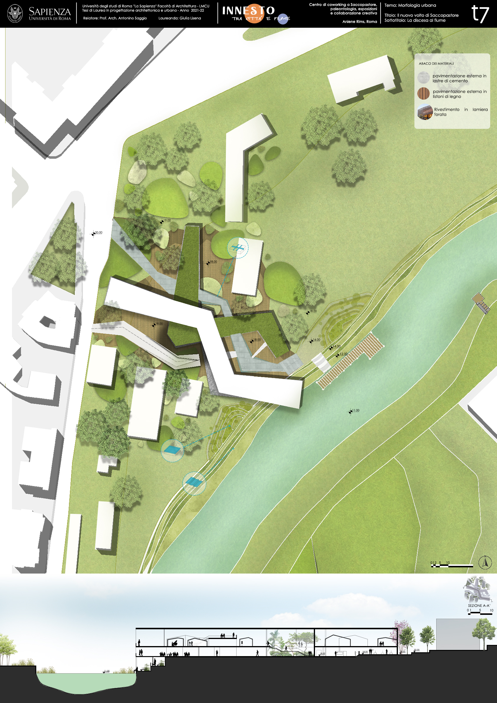 La peculiarità morfologica dell'area ha fatto da volano per la realizzazione di un progetto che ha naturalmente ha quaale obiettivo principale creare un'infrastruttura che possa stabilire un collegamento diretto tra città e fiume. Il processo compositivo ha visto in successione tre macroazioni: la rimozione della presistenza, il tracciamento dell’asse di collegamento città-fiume, la realizzazione di un volume dalla forte vovazone infrastrutturale, un “innesto” appunto che consenta di allacciare in maniera armoniosa la riva al livello urbano e viceversa. L'edificio risponde quindi con forza al principio dell "'infrastructuring" posta alla base di tutti i progetti Aniene Rims, ma che qui trova una declinazione particolrmente evidente.