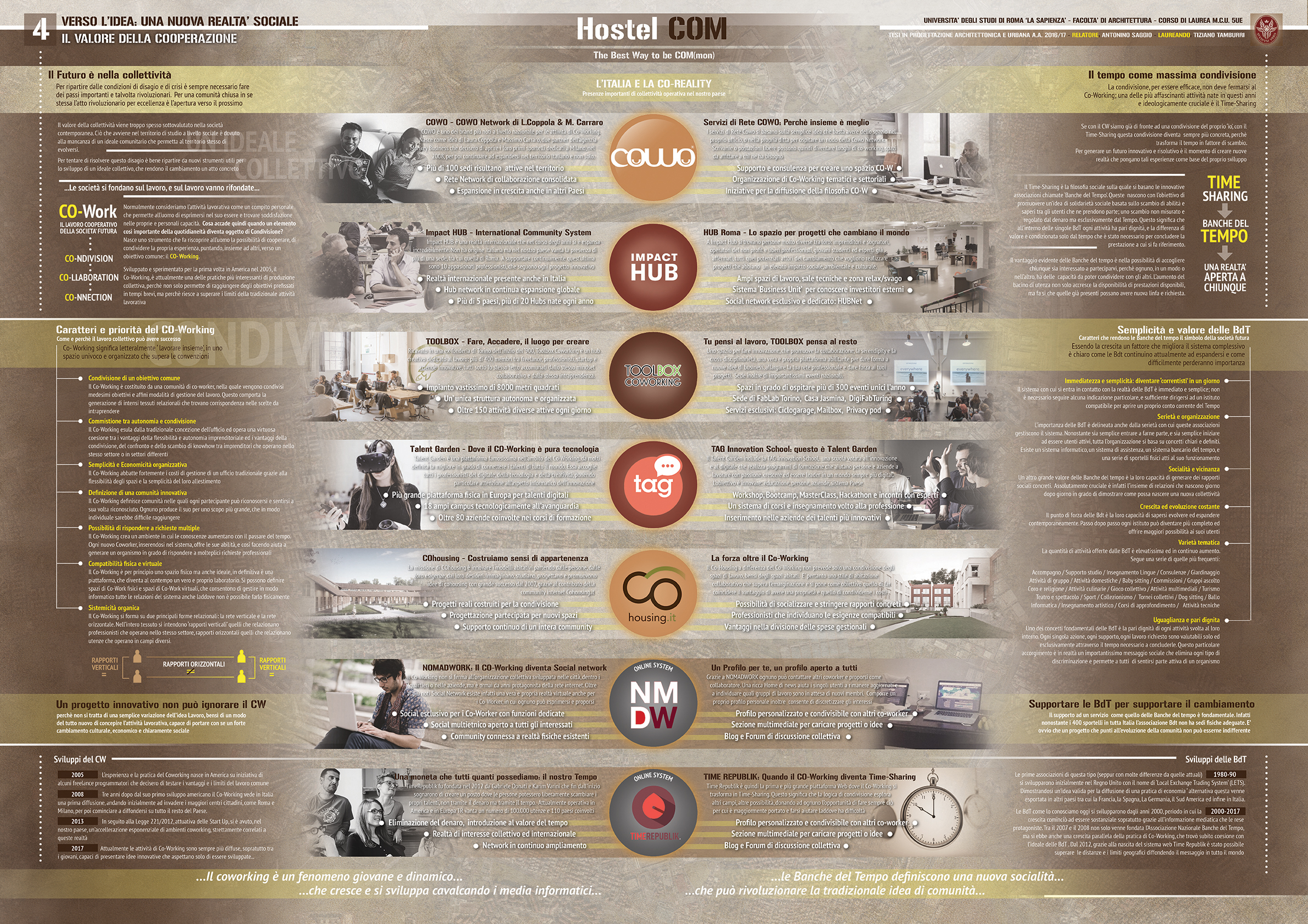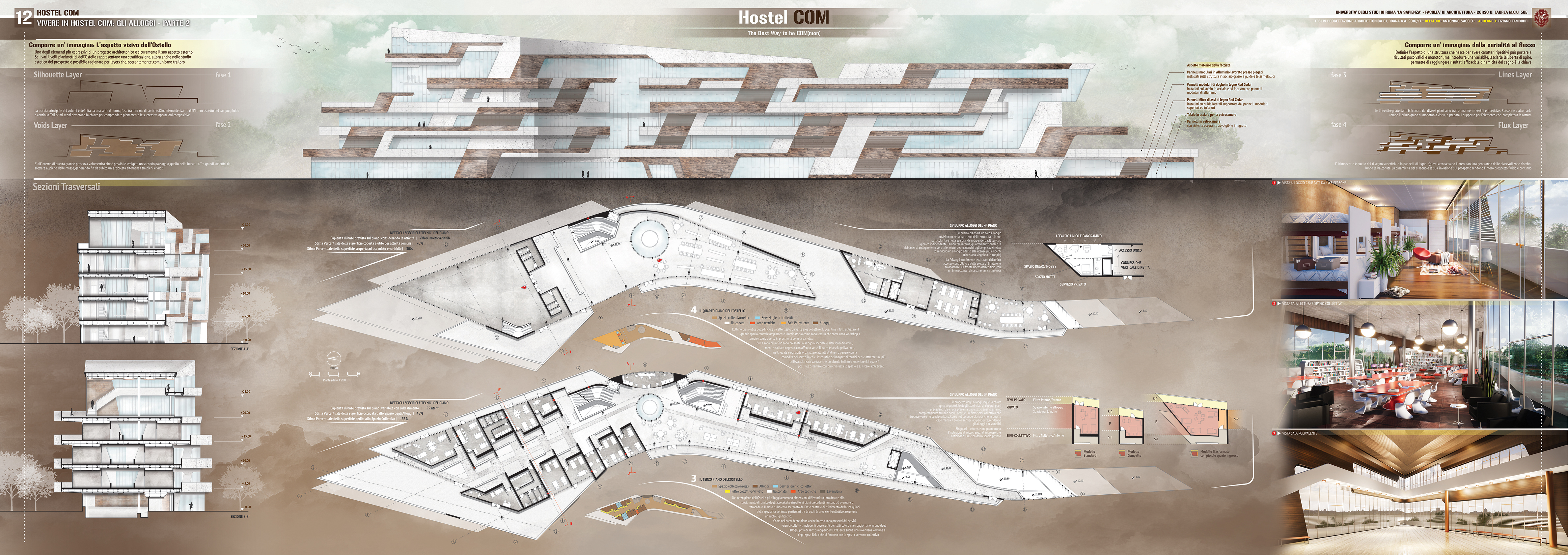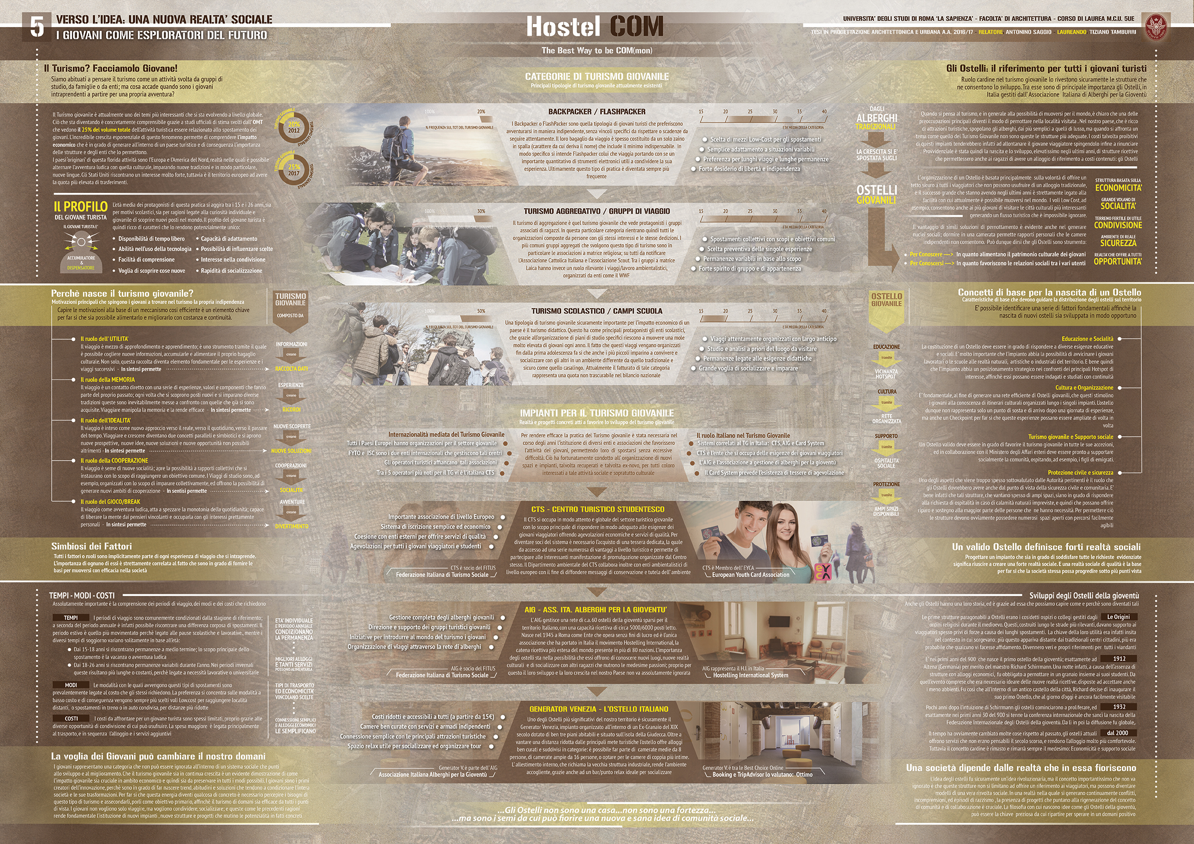 Hostel COM affronta l’assenza di luoghi aggregativi attraverso la sua funzione principale che è quella di realizzare un ostello comunitario che risponda alla domanda dei molti visitatori giovani di Roma con alloggi economici, sicuri e multifunzionali. Il progetto di conseguenza propone una vasta serie di tipologie abitative che vanno dalle camere per coppie, a quelle per piccoli o grandi gruppi o a soluzioni per residenze lavoro prolungate. Questi alloggi sono pensati insieme a spazi di mediazione e condivisione di natura semi collettiva ai diversi piani dell'ostello.