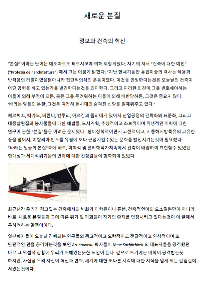 O tema básico deste texto é que a renovação da arquitetura que temos experimentado nos últimos anos, na qual esta publicação também está envolvida, não é apenas uma questão de gosto, moda ou linguagem, mas que, de fato, novas substâncias estão sendo afirmadas e, com estas, novas crises e oportunidades.