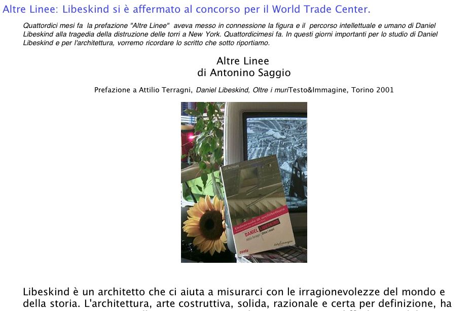 Il 26 ottobre 2006 è passato un anno dall pubblicazione del primo podcast (qualcuno ricorda?, il film il Motivo di Sant'ivo >). Alla prima sono sono succedute 79 altre trasmissioni. Innanzitutto l'intero corso del 2006 alla Sapienza su "Crisi Modernità e Information Technoly" che oltre agli studenti è stato seguito anche da altri appassionati, poi molte conferenze, alcune interviste e qualche importante progetto. Questa attività non è passata, fortunatamente, del tutto inosservata. La Apple l'ha inserita tra i suoi pochissimi link esemplificativi, ma soprattutto grazie a Maria Teresa Paternoster l'Università La Sapienza l'ha recensita sulla stampa quotidiana. Per autofesteggiare la minuscola ricorrenza è pubblicato un podcast su un tema che appassiona molti. Come possiamo definire il paesaggio?. E' un intervento orale in cui anticipo un mio scritto che apparirà in una pubblicazione sul tema di Franco Zagari. Buon ascolto! >