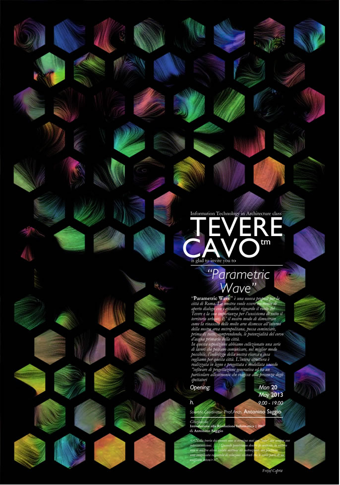 Il corso di Progettazione Architettonica Assistita V anno 8 crediti formativi, presenta una combinazione di aspetti teorici e di aspetti applicativi. Quelli teorici vertono sui rapporti che intercorrono tra Information Technology e Architettura in questa fase storica. Dal punto di vista applicativo gli studenti sono guidati attraverso dei tutorial e l'uso del laboratorio alla sperimentazione dei diversi ambienti informatici e alla comprensione delle diverse possibilità operative. Il percorso si svolge gradualmente in otto cicli tematici che vanno dal "Mondo dei Raster" a quello "dei Modificatori". Ciascun ciclo offre delle lezioni sul suo contesto teorico, su quello informatico e applicativo e sui paralleli sviluppi nella ricerca architettonica contemporanea. Alla fine di ciascun ciclo, gli studenti redigono una specifica eserticitazione pratica. Tutte le esercitazioni dalle prime a quella finale sono guidate da uno stesso tema di ricerca che quest'anno è definito dal titolo del corso: "Tevere Cavo. Modernità, Crisi e Information Technology" e i cui risvolti saranno gradualmente illustrati agli studenti a cominicare dalla prolusione. Il corso, che ha obbligo di frequenza e si svolge in un laboratorio di informatica, inizia il giorno 27 febbraio 2013 e termina con una seduta di esami che è anche una conferenza pubblica il giorno 19 luglio 2013.