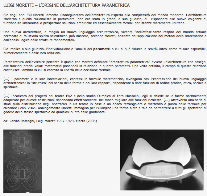 In questo senso Luigi Moretti, uno dei più interessanti Architetti Italiani, che ha certamente il problema del significato! Lo ricerca anche nella matematica, nell'architettura Parametrica che in questo contesto, di nuovo più che meccanismo è orizzonte anche di senso, orizzonte in cui l'indispensabilità della scienza rientra come grande necessità dell'architettura. In questo non è il magico, non è l'esoterico non è il pitagorico della antica architettura ma qualcosa di nuovo di contempoaraneo