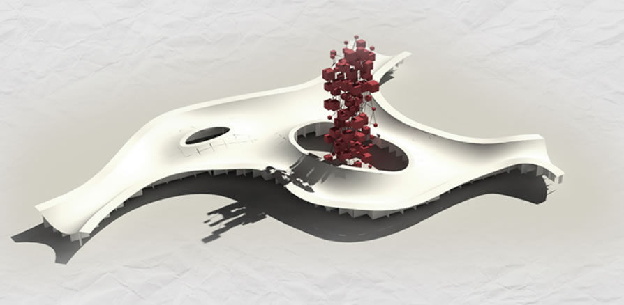 La proposta di istallazione al Maam si concretizza nell'estensione del museo verso gli spazi aperti, in particolare là dove l'acqua un tempo era l'elemento purificante del salumificio: le vasche. Oggi la immaginiamo "scorrere" con dei salti tra una vasca e l'altra e disegnare curve che si avvolgono in grandi "onde" cariche di energia e forza vitale. Un percorso dalle sinuosità cangianti poiché disegnato da una rete elastica la quale si illumina e cambia forma nell'interazione con il visitatore e al tempo stesso ne modifica la visuale. L'osservatore/abitante, coerentemente con l'arte contemporanea, diventa protagonista assoluto e, come una molecola d'acqua in movimento, scivola seguendo le curve, finisce nell'onda, ne riaffiora, si guarda intorno, può giocare con la luce, può godere di opere d'arte posizionate in punti strategici o semplicemente prendersi un po' di relax e, se nel frattempo giunge la notte, può incontrare la luna e dialogarci!