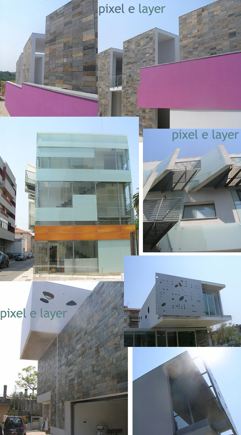 riflettendo sulle ultime lezioni: lo schermo - pixel ed i layer - vettori, e sul lavoro di Giovanni Vaccarini come già hai anticipato sul tuo sito riguardo il concetto di una interpretazione intelligente di alcuni temi dei nostri tempi, ho cercato di capire meglio come Giovanni nella sua architettura utilizzi il mondo dei  raster e quello dei layer. Bè, intanto li utilizza entrambi soprattutto nella composizione dei prospetti. C'è come dire un primo livello: i pixel, lo schermo, costituito da una superficie trattata o con un rivestimento di pietra che fa vibrare le superfici oppure di vetro in modo da creare effetti di trasparenza e semitrasparenza, opacità e chiaroscuri.