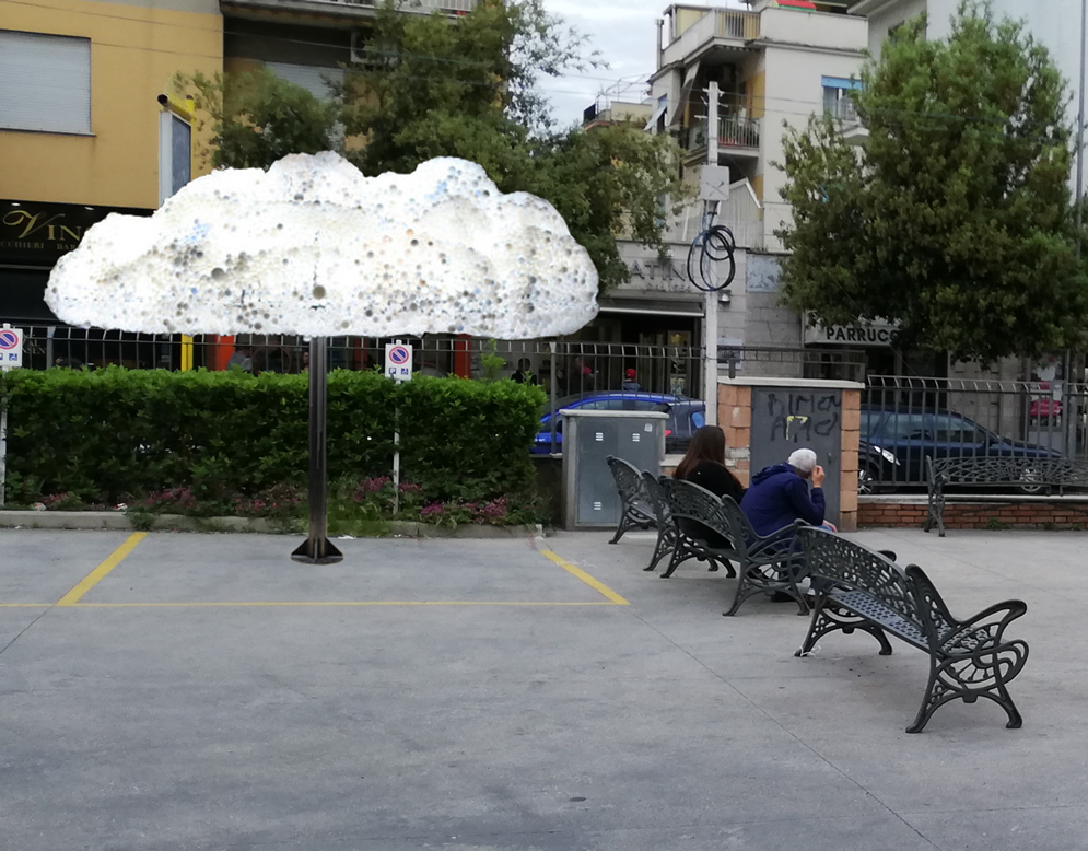 FIl percorso che ci ha portato alla concettualizzazione dell’installazione artistica è partito dalla nostra ferma convinzione che non esista uno spazio urbano, seppur sottoutilizzato o in stato di abbandono, che non sia in grado di offrire ancora qualcosa alla comunità. La sfida progettuale che pone in genere uno spazio abbandonato è quella di ridare slancio sociale e vivibilità allo spazio. In questo caso per noi la necessità dell’area di studio era quella di recuperare, oltre alla percezione visiva e funzionale, anche e soprattutto la vivibilità e la scoperta di un ambiente che evochi emozioni, al sicuro dal caos, in grado di generare energia, tramite movimento e linee di forza, ma al tempo stesso tranquillità. Queste componenti trovano forma e senso in uno spazio che sia contemporaneamente di connessione (tra le fermate dell’autobus), di attesa, di gioco e di riscoperta della natura. Le inter-relazioni ancora possibili tra i cittadini e l’area di studio sono rappresentate in maniera fisica da un paesaggio colorato, evocato nella cromia ma al tempo stesso concreto e tangibile nella frequenza delle cime che compongono l’installazione. I tiranti in acciaio che tendono le cime si appoggiano a loro volta alla struttura semi fatiscente della pre-esistenza. Il riutilizzo della pre-esistenza diventa di fondamentale importanza in un’ottica di risparmio economico. La concezione dell’installazione è stata portata avanti avvalendosi degli strumenti di progettazione parametrici (Grasshopper) e di modellazione 3D (Rhinoceros), in maniera tale da gestire concretamente (e non solo per ipotesi visive) le dimensioni e il numero complessivo delle cime colorate nonché dei cavi tiranti in acciaio.