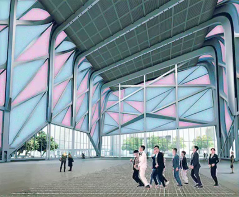 Infatti bisogna capire che il materiale usato è l' EFTE! libro con esempii di Filippo Giovannetti Antonino Bontempo, Media Superfici.. tesi di dottorato Parte a, parte B Si tratta di un materiale plastico usato in opere imporatnti a cominciare dallo stadio Mercedes Monaco di Herzog e de Meuron che ha non solo capacità tecniche notevoli ma anche potenzialità appunto di diventare "schermo in architettura". Infatti se è accoppiato a sistemi "a led" (inseriti all'interno del cuscino della Efte e in cui ogni punto luminoso può variare e appunto diventare immaginee schermo) si è ormai ottenuto da tempo uno schermo che diventa edificio... studiare e approfondire questo punto anche tecnologicamente...