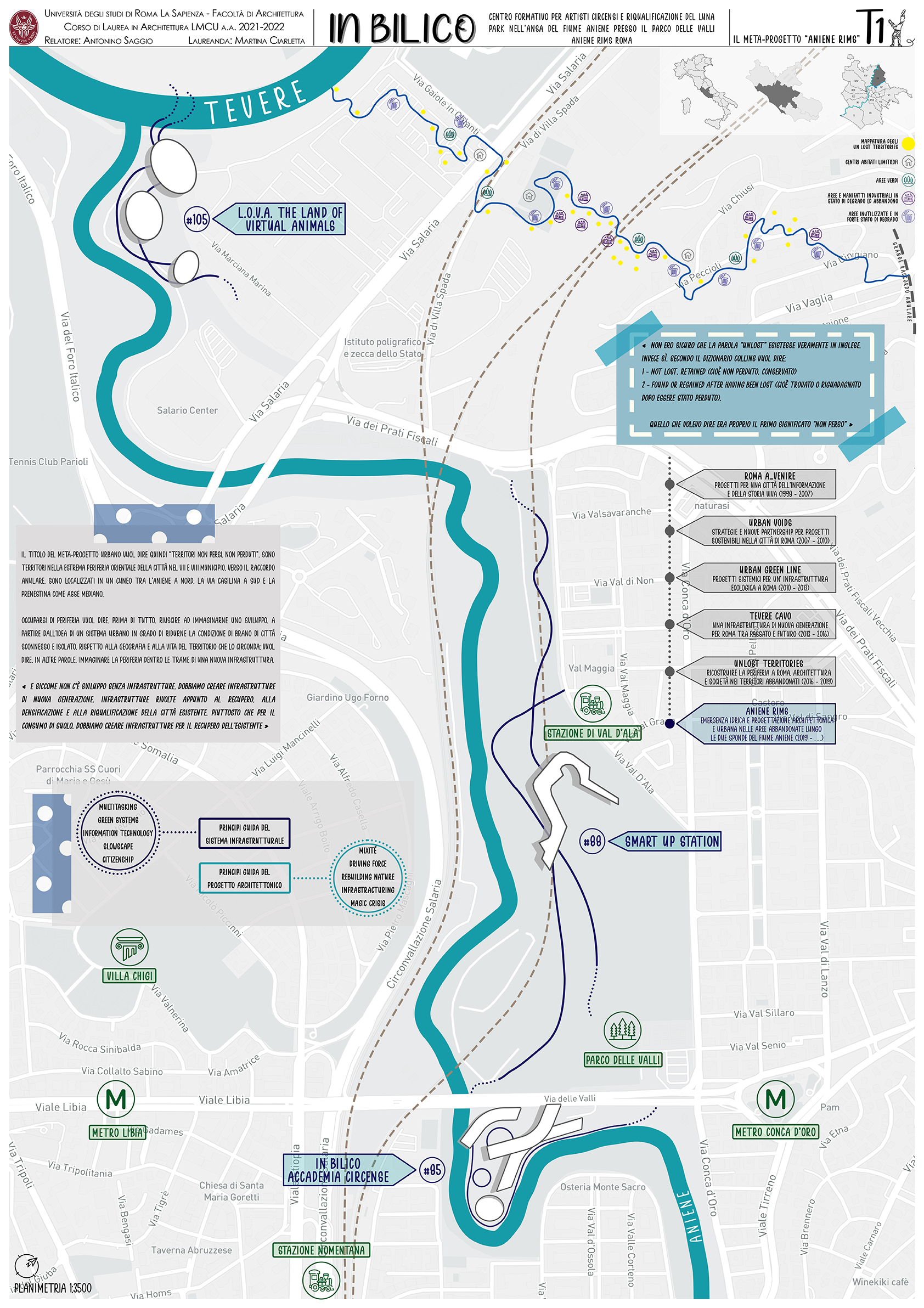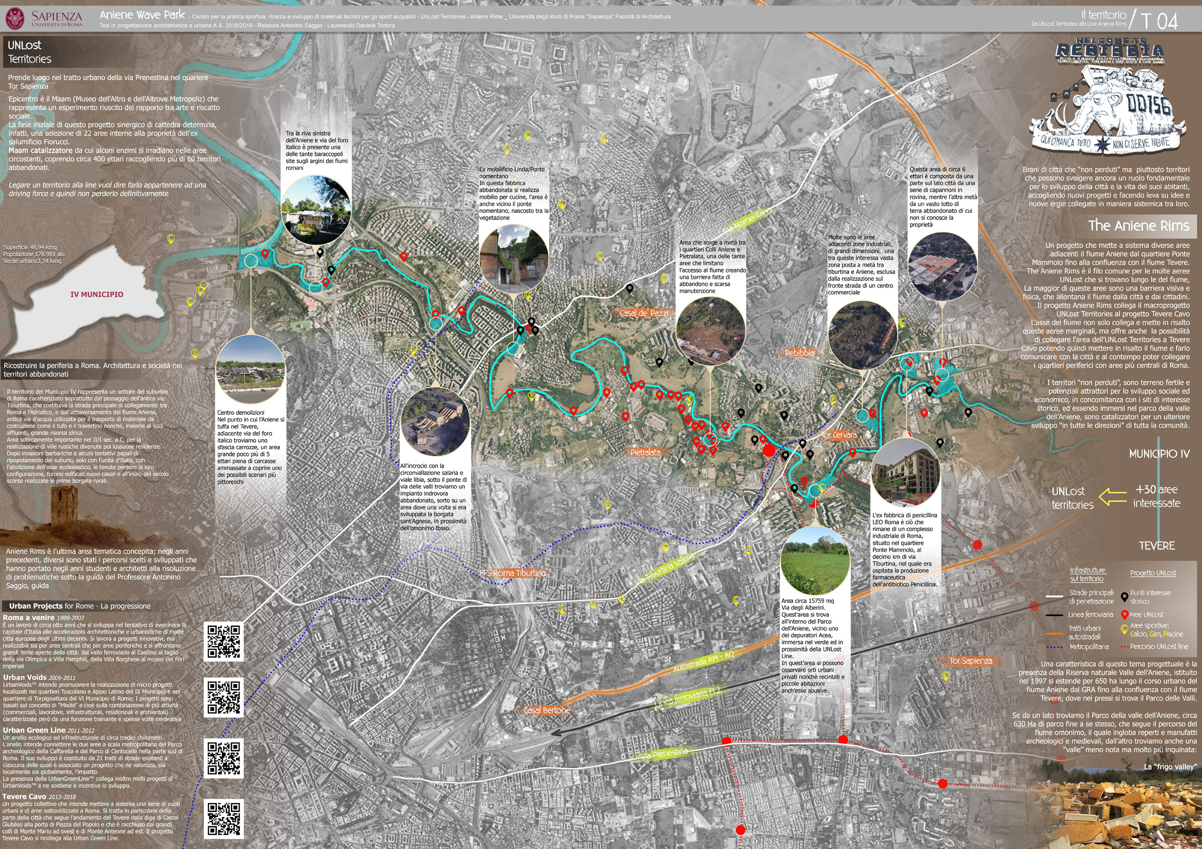 Le proposte progettuali (vedi la Mappa google - https://bit.ly/2Az7lm1 - che li localizza, e il Blog - unlostterritories.blogspot.it/ - che ne permette l'esame), si radicano alle necessità specifiche dell'ambiente urbano lungo un corso d'acqua, e allo stesso tempo propongono morfologie e programmi innovativi, spesso elaborati in rapporto con associazioni, enti e cittadini che sono interlocutori attivi del processo propositivo. L'insieme delle aree di Aniene Rims, si relazionano con una rivalutazione del corso del fiume quale infrastruttura di nuova generazione nella città costruita. Il suo sviluppo è suddiviso in 15 tratti, in ciascuno dei quali sono previste azioni sia a scala locale che globale. Le azioni progettuali si inseriscono nelle cinque categorie fondamentali delle infrastrutture di nuova generazione nella città costruita:. Azioni tese verso una maggiore Multifunzionalità (1), verso lo sviluppo di Green systems (2). verso l'Information Technology Foam (3) verso una valorizzazione dello Slowscape (4) e verso lo sviluppo di una Cittadinanza piena e consapevole (5) "In questa fase storica dobbiamo limitare al massimo il consumo di suolo agricolo, ma non possiamo bloccare lo sviluppo! Dobbiamo soltanto invertirne la direzione. E siccome non c’è sviluppo senza infrastrutture, dobbiamo creare infrastrutture di nuova generazione, infrastrutture rivolte appunto al recupero, alla densificazione e alla riqualificazione della città esistente." (A. Saggio, "L'Architetto", aprile 2014). Questi prinicipi con particolare attenzioni al terzo "infromation Technology Foam" sono oggetto del Corso Teorie Metodi Strumenti per l’Informatica in Architettura. Il laboratrio di sintesi si concencetra alla scala architettonica e urbana. Le cinque categorie che articolano i progetti sono 1. Mixitè=Inhabiting+Exchanging+Creating=Synergy, 2. Driving Force; 3. Rebuiding Nature; 4. Infrastrctuuring; 5. Magic Synthesis (Architecture= construction, +functions+ site+Syntax+Expression+Imprinting=SYNERGY