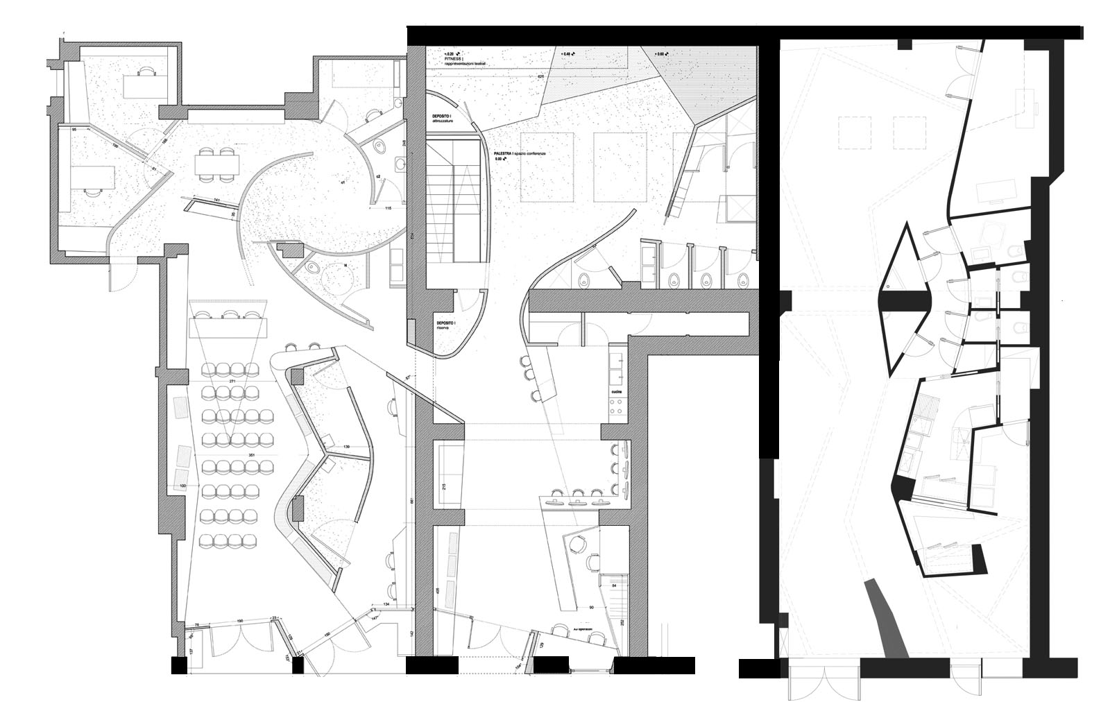 C4. Schematizzazione delle zone serventi e servite al 500 come fosse una macchina! elementi di distribuzione ed energetici (cioè servizi da quelli igenici a tutti di vario tipo)