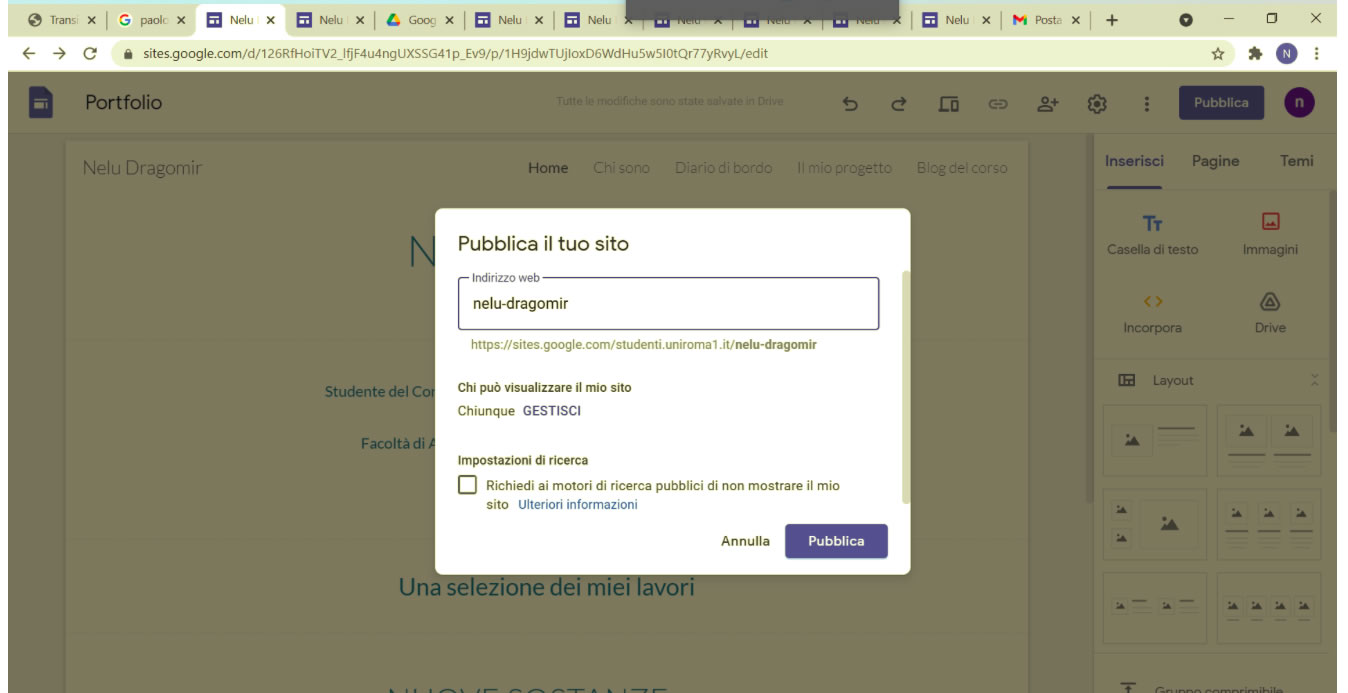 8. Cliccare su pubblica inpoche parole si tratta di rendere pbblico l'accesso al sito in maniera che non esistano vincoli-