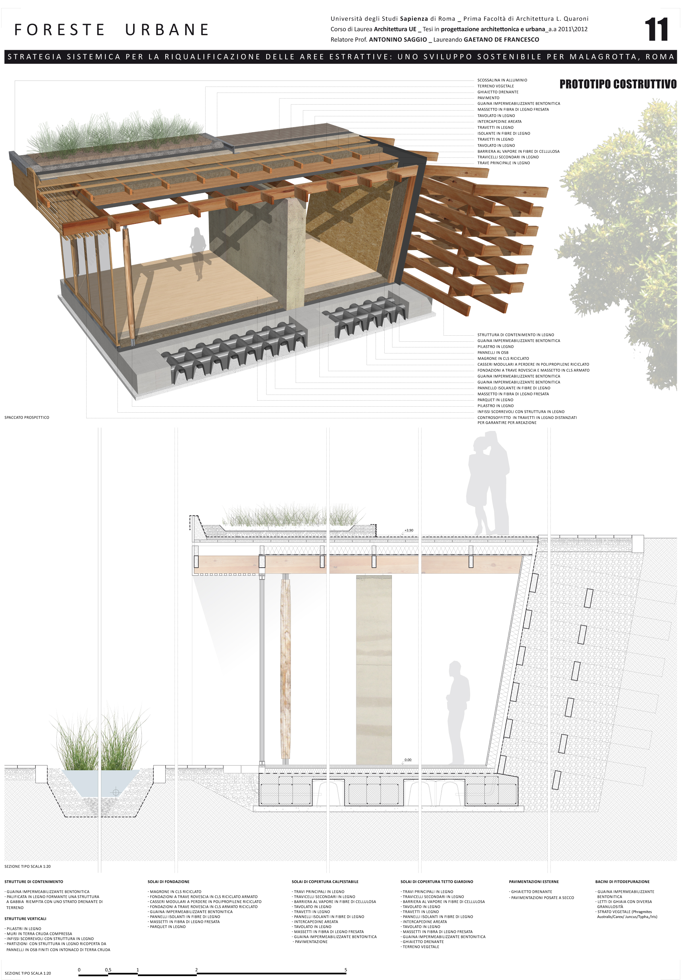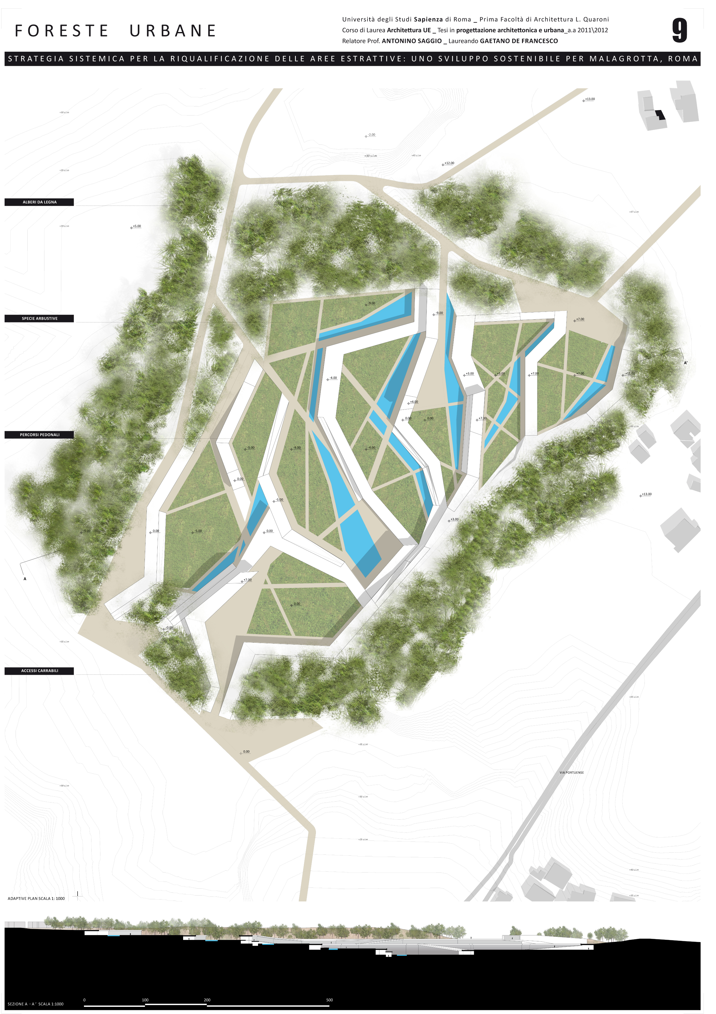 Così il sistema diel ritombamento dei rifiuti può determinare buona parte del recupero ambientale delle cave abbandonate. Il progetto Foreste Urbane prevede anche di più, e qui entra in gioco l’architettura. Nelle parti pianeggianti delle ex cave, circondate dai terrapieni con le nuove foreste cedue, possono realizzarsi una serie di edifici che aderiscono ad un progetto contemporaneo di mixité. La caratteristica base di questi edifici è legata ovviamente alla produzione, trasformazione, commercializzazione del legname ma anche un insieme di attività culturali e didattiche, ricreative e per il tempo libero. Insomma al vecchio ciclo inquinante del cemento (e dei rifiuti indifferenziati in discarica) si può sostituire il nuovo ciclo del legno (e dei rifiuti differenziati). E tutto questo determina economia, determina energia, determina progetto. L’architettura e la tecnologia naturalmente accompagnano l’idea. Gli edifici stessi sono in legno e hanno forme sinuose che si adattano sia in pianta che in sezione alla cave. Gli spazi sono articolati in una successione di piazze, di strade e di slarghi e l’intero progetto può essere diviso in fasi di costruzione cominciando dagli elementi di recupero naturalistico per procedere gradualmente con le costruzioni.