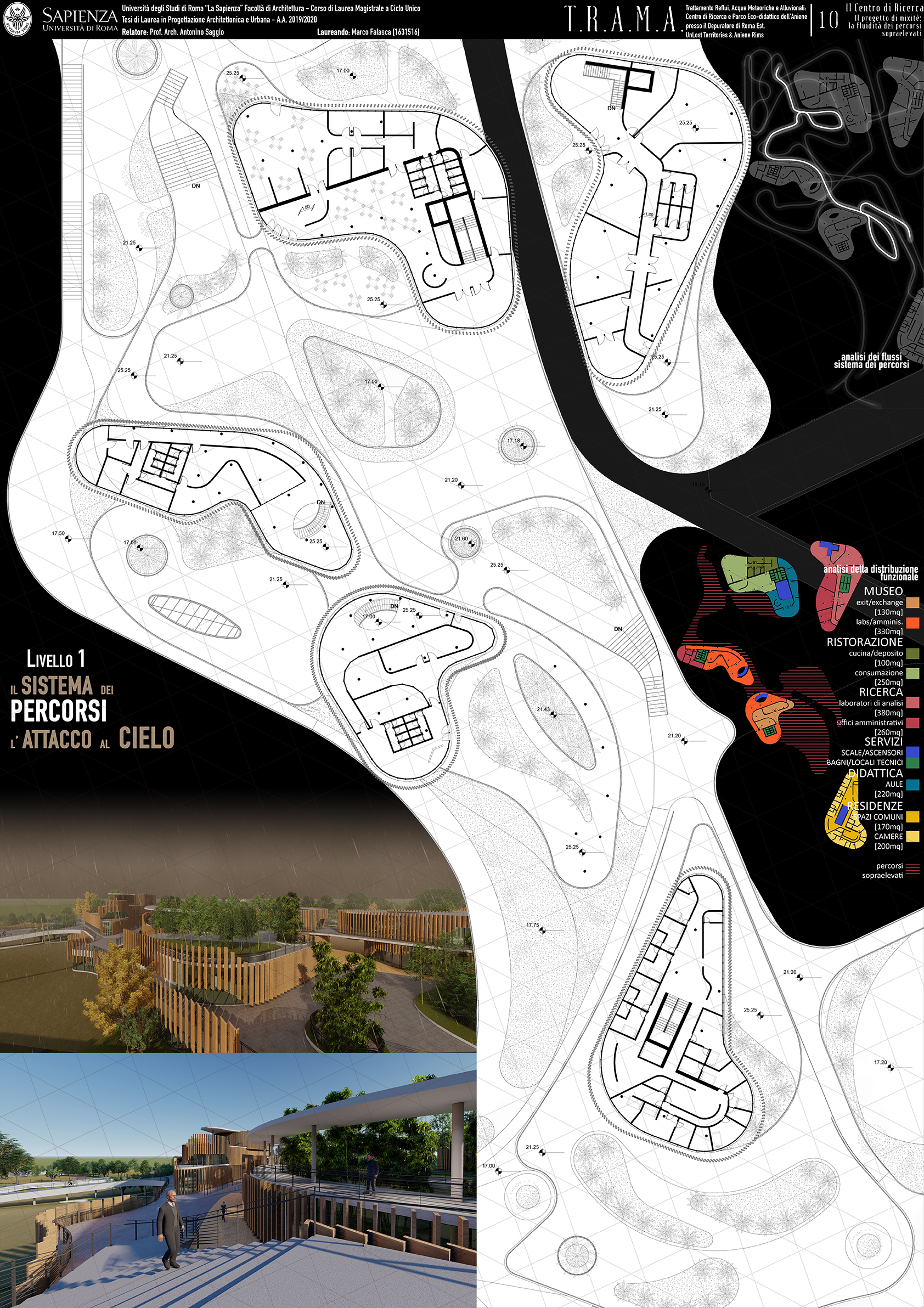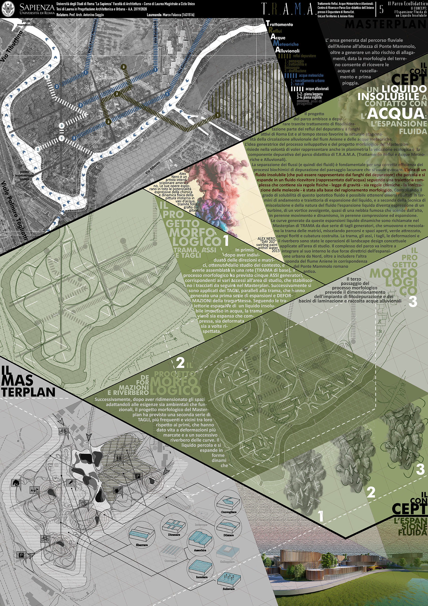 Una parte di città soggetta ad innumerevoli criticità (la marginalità e segregazione del fiume Aniene rispetto al contesto urbano, la presenza di un depuratore delle acque che necessita di un miglioramento del trattamento dei reflui, le inondazioni sempre più frequenti negli ultimi anni) vengono affrontate nel progetto T.R.A.M.A. con una serie di mosse coerenti e tra loro sinergiche. Da una parte si crea un paesaggio dell'acqua, in sintonia con ormai mature e numerose esperienze internazionali progettato con tecniche naturali che assecondano i flussi dell'acqua anziché ostacolarli, dall'altra si disegnano spazi aperti e un complesso architettonico adatto alla valorizzazione dell'insieme. Si crea così anche a Roma un Eco-parco che è contemporaneamente un centro didattico e museale che valorizza una significativa ansa del fiume Aniene.
