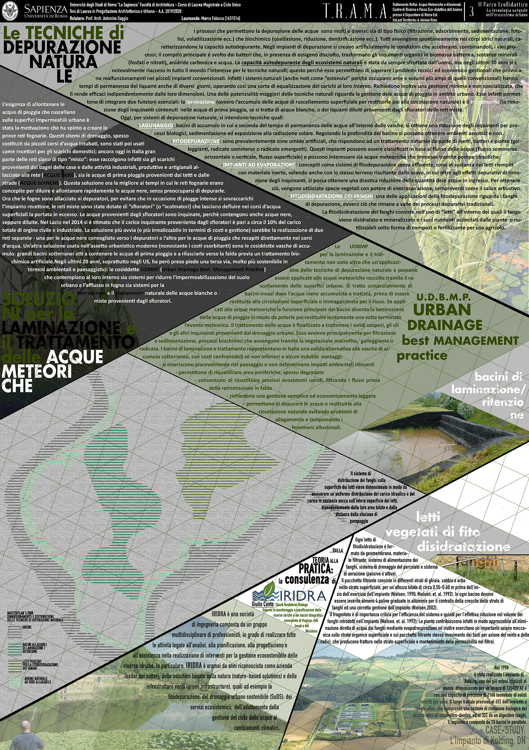 T.R.A.M.A. è quindi progetto ambizioso che aspira a recuperare in termini urbani, architettonici, ecologici e sociali l’ansa generata dall’andamento del fiume Aniene nel suo tratto urbano all’altezza di Ponte Mammolo, nel quadrante Est della città di Roma. Il parco eco-didattico è stato disegnato in funzione dell’innalzamento delle acque in occasione di ingenti fenomeni di precipitazione, in modo da gestire e di ridurre il carico idrico delle piene alluvionali. Il progetto inoltre favorisce lo smaltimento sostenibile nonché il recupero dei fanghi provenienti dal vicino Depuratore gestito dall’Acea, grazie all’integrazione con tecniche depurative naturali quali la fitodisidratazione dei fanghi e la laminazione delle acque meteoriche. Il parco infatti prevede due grandi bacini di ritenzione idrica, in grado di assorbire il fenomeno delle bombe d’acqua e quello delle piene alluvionali ad esso collegate.