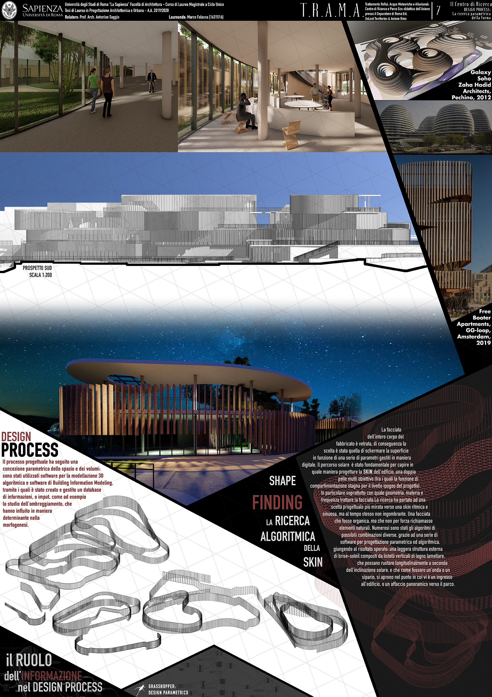 Dal punto di vista architettonico, il centro di ricerca si sviluppa in maniera volumetricamente fluida e organica su 4 livelli che si articolano insieme ad un sistema di piazze e percorsi sopraelevati. Il progetto di mixitè prevede al suo interno oltre alla componente di ricerca, altre funzioni quali l’esposizione museale, la didattica e una piccola componente residenziale. La facciata è stata progettata grazie all’utilizzo di software per la progettazione algoritmica e parametrica che sono stati determinanti per gestire il complesso ed interagente numero di informazioni e la loro geometria.Il lavoro si è avvalso, come discusso nella tavola 3, della consulenza del biologo Giulio Conte, esperto in monitaraggio delle acque e del lavoro dell'architetto Gaetano De Francesco, vedi tavola 4 e della sua dissertazione dottorale "Infrastrutture dell'Acqua".