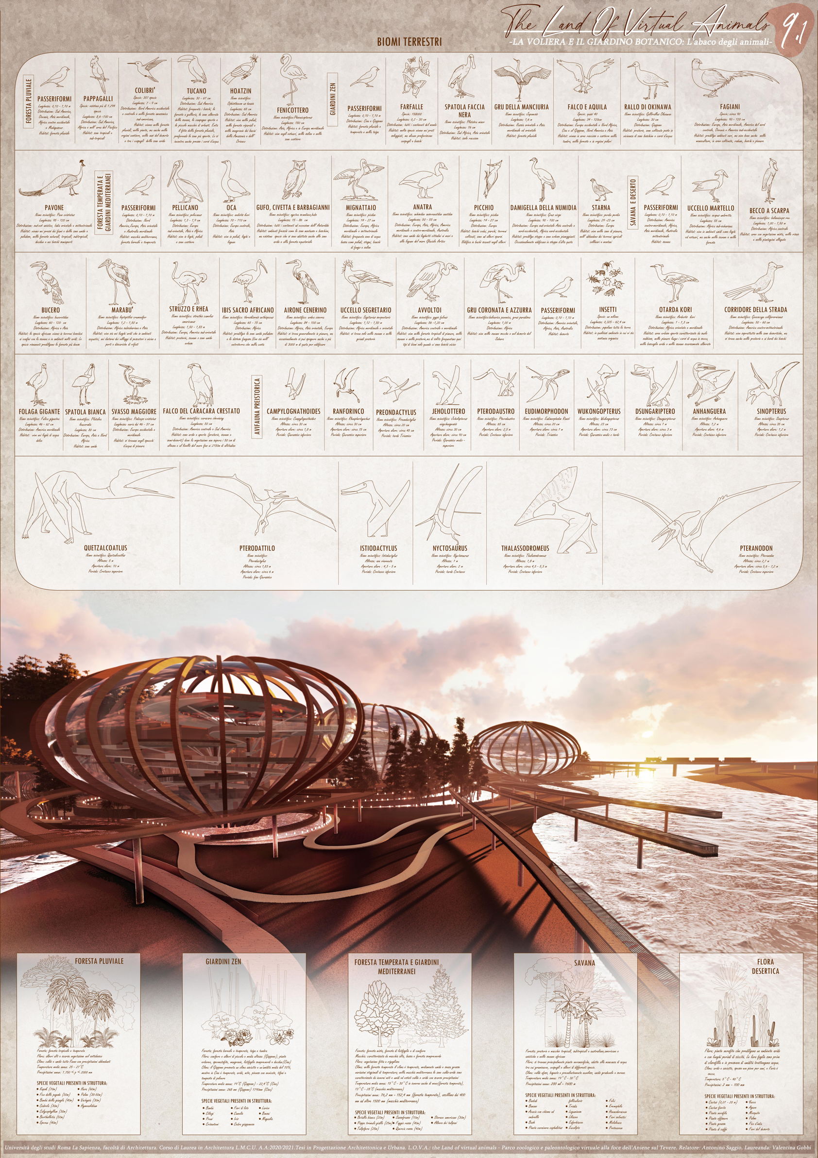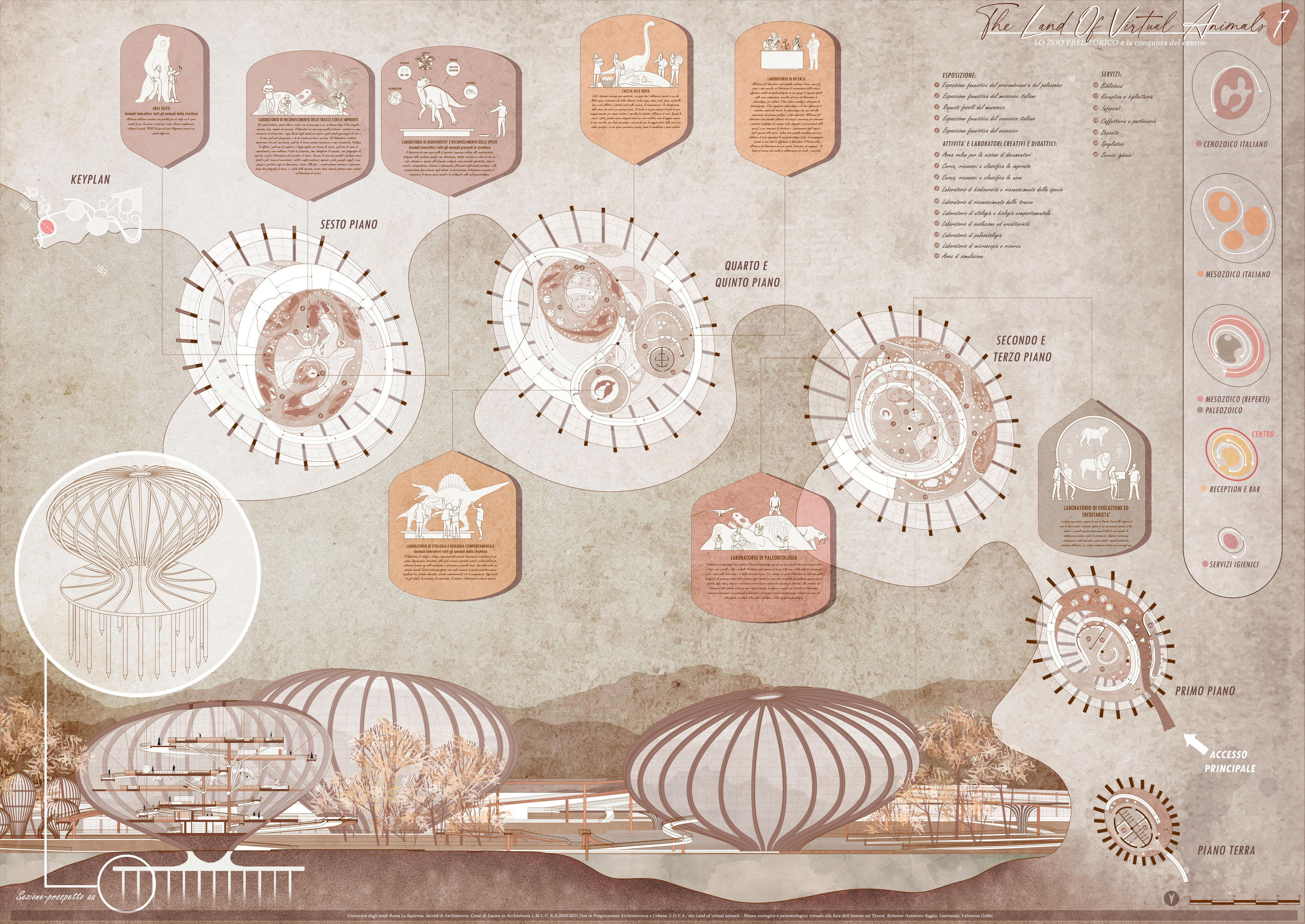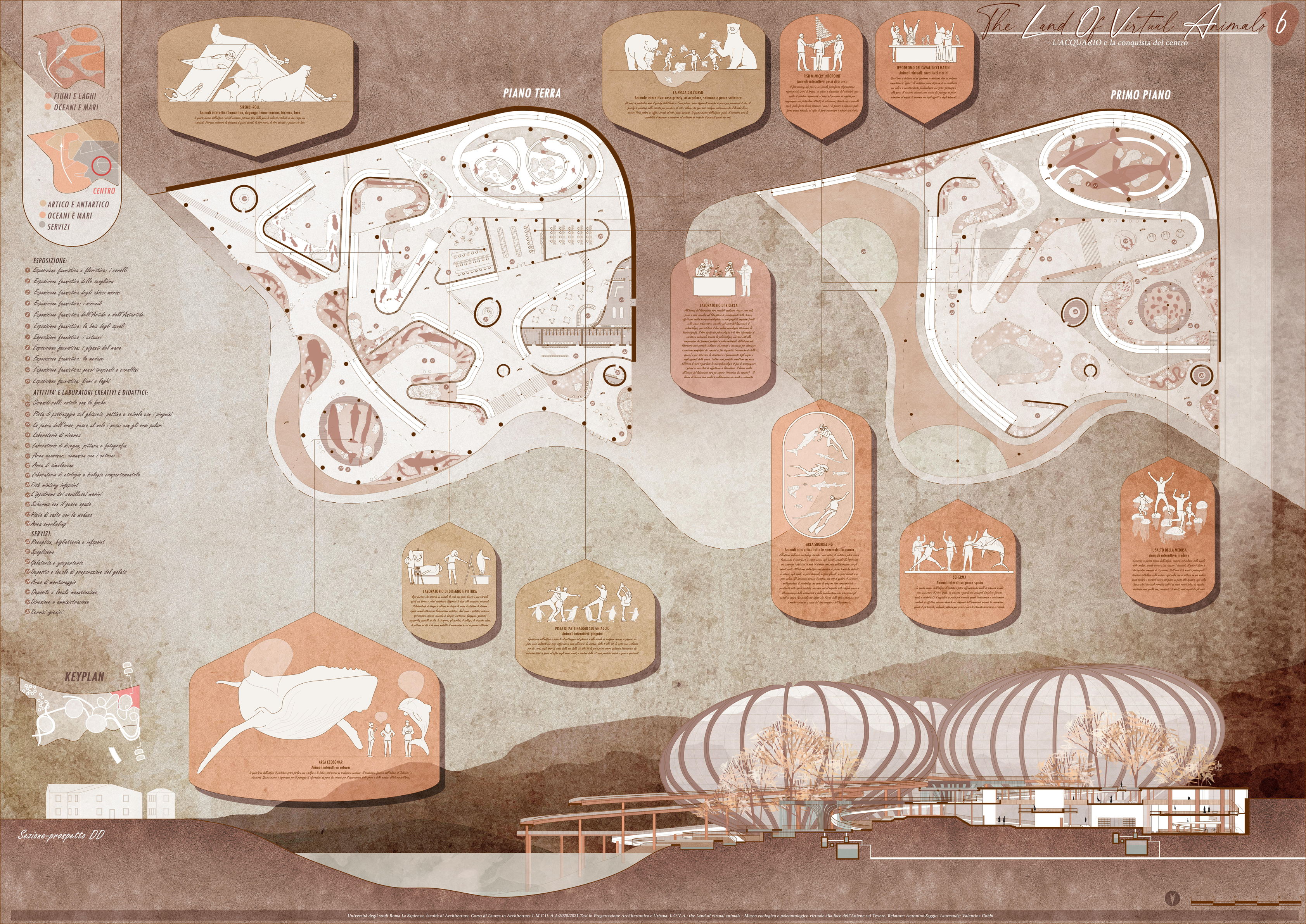 L’area di progettazione si compone in particolare di quattro edifici: lo zoo preistorico, lo zoo terrestre, l’acquario e la voliera con il giardino botanico. L’organizzazione funzionale interna è divisa in aree tematiche diverse per ogni edificio: habitat marini, continenti, biomi terrestri ed ere geologiche. Ad ognuna di queste zone corrispondono gli animali appartenenti a tali habitat con attività interattive ad essi associate.