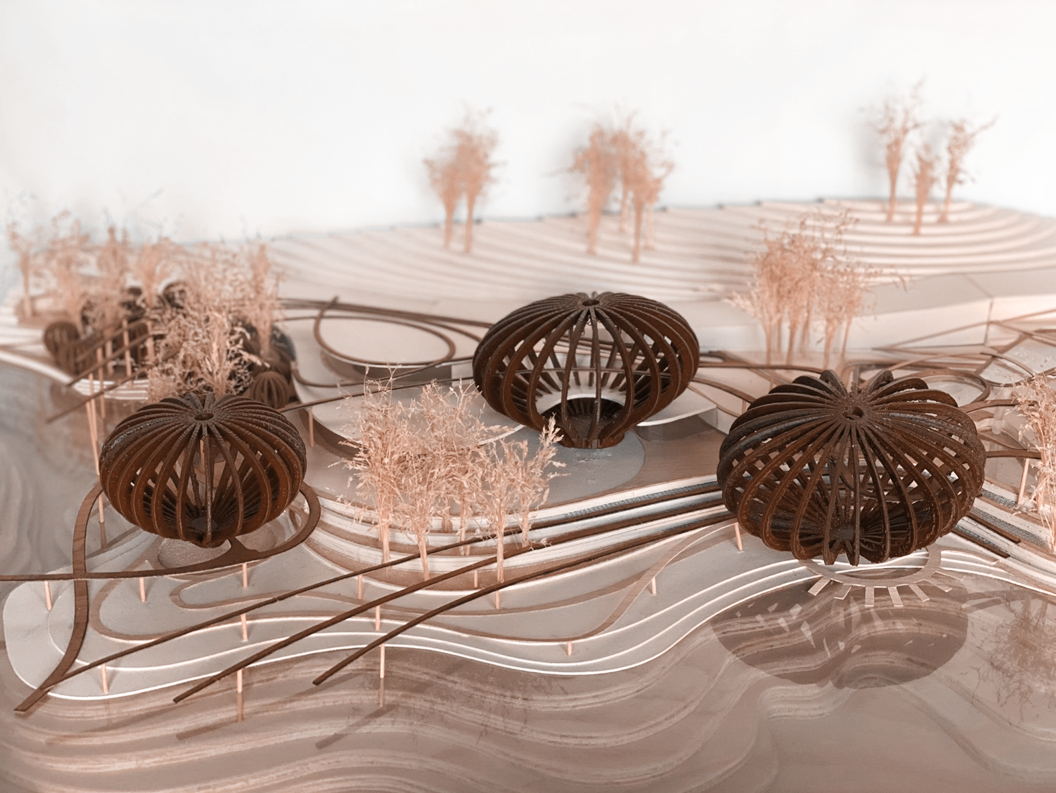 Il disegno complessivo, così ottenuto, si compone di una serie di linee virtuali che possono a questo punto trasformarsi in pieni e vuoti, percorsi a terra, percorsi sospesi, piazze, aree verdi, edifici interrati o scoperti. La morfologia del progetto rappresenta metaforicamente i reperti fossili degli animali preistorici che si sono estinti per lasciare spazio alle forme di vita attuali. Questo contrasto tra mondo antico preistorico e mondo moderno ologrammatico è uno dei dati salienti del progetto. Il progetto prende forma anche dal rapporto di dare avere che si crea tra il fiume e l’architettura e dalle particolari infrastrutture idriche adottate, fondamentali anche come risoluzione delle importanti emergenze idriche che riguardano l’area.