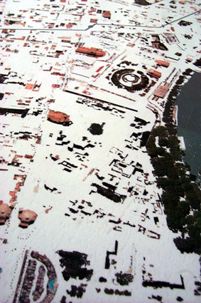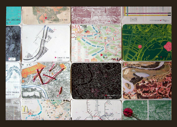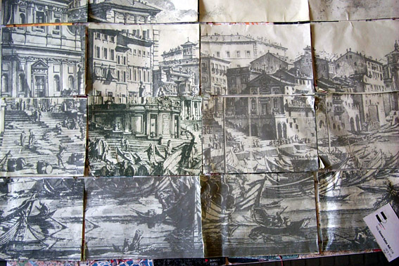 (Sopra) Vista del Porto di Ripetta (da Piranesi) sul recto Pianta del Nolli, montata e piegata su tela. All'interno di una tasca esce una selezione di Piante di Roma in formato mouse pad (sotto)