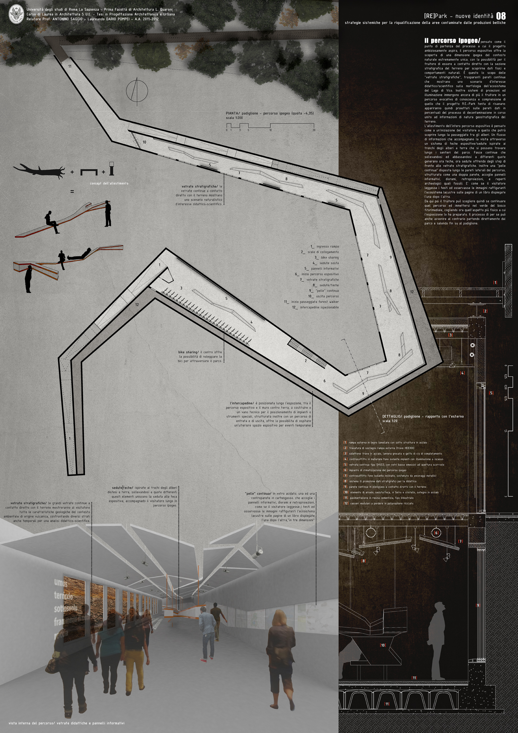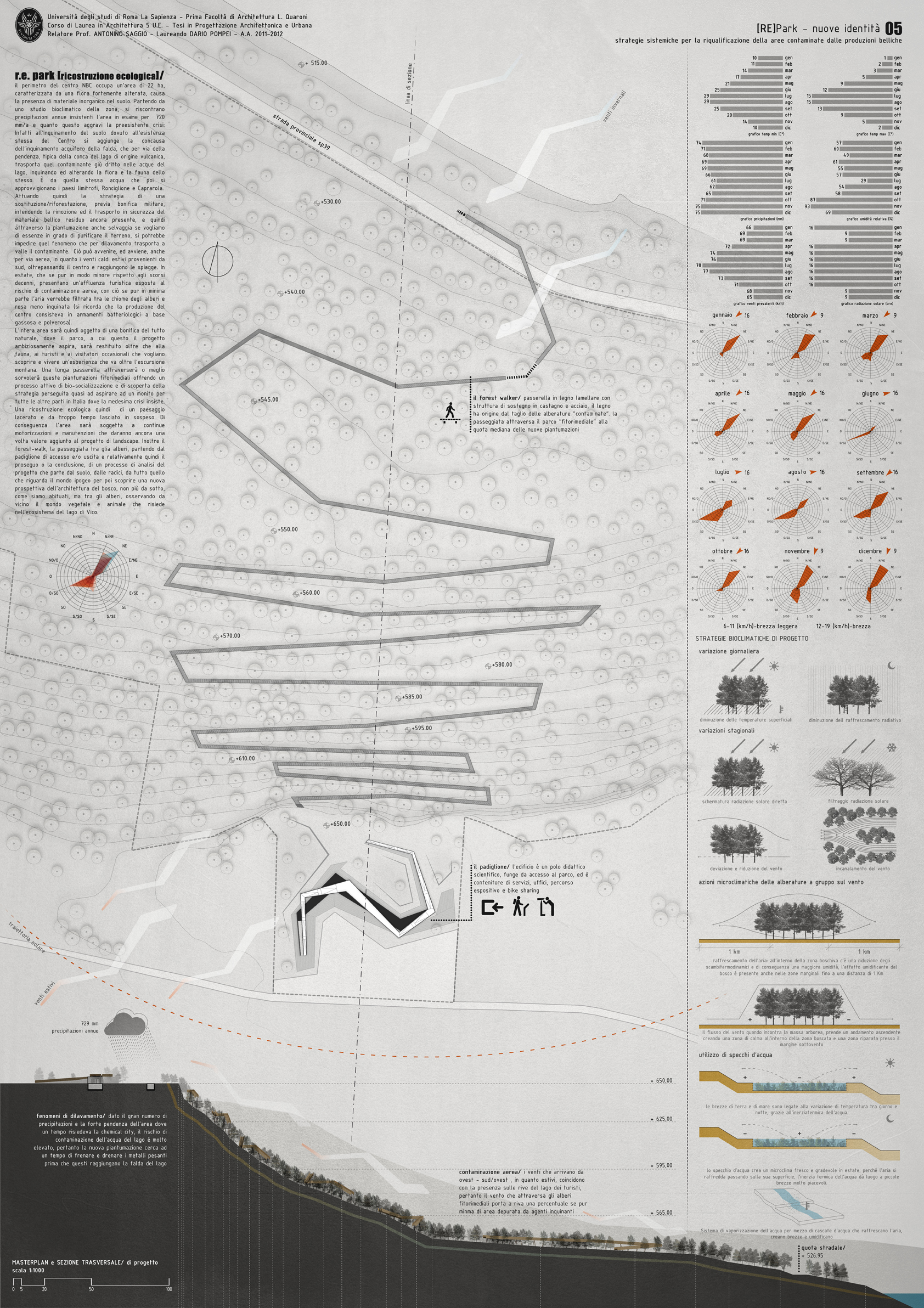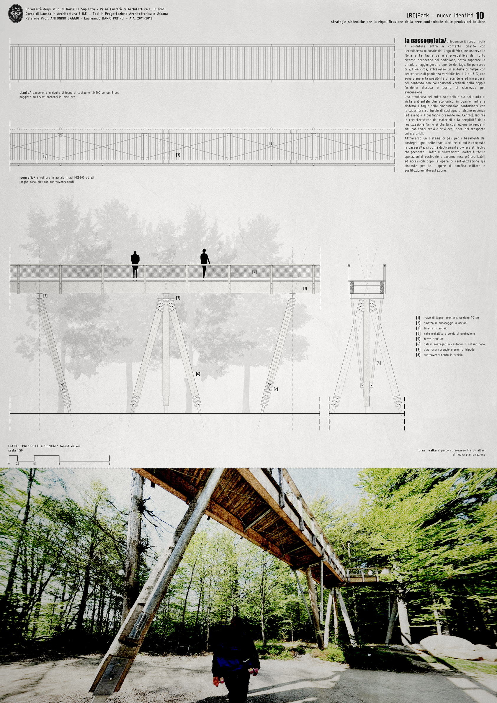 Un nuovo parco sorgerà nella superficie oggi occupata dai residui militari e l’area sarà restituita oltre che alla fauna, ai turisti e ai visitatori che potranno vivere un’esperienza che va ben oltre una semplice escursione mopntana. Una lunga passerella, il forest-walk, attraverserà le nuove piantumazioni fitorimediali in quota. Al visitatore sarà offerto una partecipazione estetica e culturale al processo di bonfica con una sorta di "bio-socializzazione" e una scoperta anche didattica e culturale della strategia perseguita. Il nuovo parco sarà soggetto a continue monitarizzazioni e a manutenzioni che daranno valore aggiunto al progetto di paesaggio. Il forest-walk si innesta in un padiglione di accesso che è pensato attraverso un processo metaforico e spaziale. Il visitatore scende di quota iniziando un percorso didattico espositivo che illustrerà la centralità suolo e del mondo ipogeo (terra, microbi, radici, vita animale e vegetale) per poi emergere alla luce ed aprirsi a una nuova prospettiva del bosco: questa vista avviene iniziando il percorso lungo il forest-walk in quota. Il percorso permette al visitatore una percezione non più dal basso, come di norma, ma “tra” gli alberi alla quota dei rami, consentendogli di osservare da vicino il mondo vegetale e animale dell’ecosistema del lago di Vico. Il padiglione di accesso e la sua piccola funzione culturale ed istruttiva insieme al forest-walk connettono inotre la quota alta delle falda vulcanica, in cui sorgono alcune attrezzature turistiche, alla quota bassa del bacino lago: i flussi turistici possono cosi attraversare il nuovo parco e fruire le coste del lago rlasciandole integre alla loro vocazione naturale.