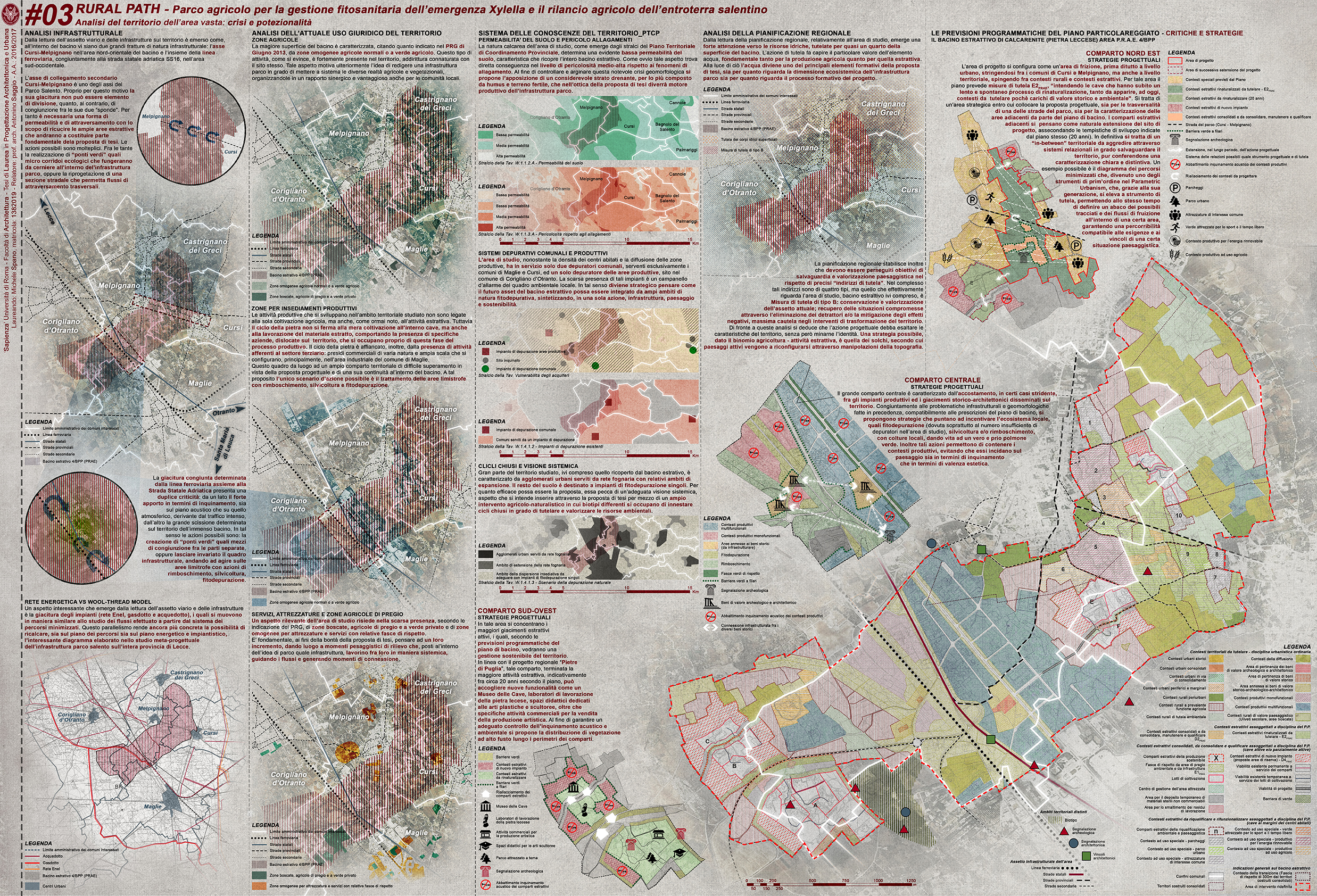 Il territorio del Salento si ritrova così al centro di un'incessante guerra fra deturpazioni agricole da una parte e azione estrattiva incontrollata dall'altra. Porre un freno al quadro negativo che ha caratterizzato l'intera provincia di Lecce, dal 2010 a oggi, vuol dire riflettere anche agli equilibri che per secoli hanno tenuto assieme cave e agricoltura. Ed è proprio in questa direzione che si muove Rural Path, che tenta di proporre innanzitutto un programma adatto ad invertire questa tendenza: il progetto punta in primo luogo a costruire una filiera in situ, chiara e trasparente nella gestione del fenomeno epidemico, soprattutto nel pieno rispetto degli operatori del settore; successivamente intende valorizzare l'agricoltura locale, attività cardine del paesaggio e dell'economia salentina, già vittima delle agromafie; in stretto rapporto a quest'ultimo punto, l'interesse di Rural Path deriva anche dall'attento programma di tutela e valorizzazione del luogo, programma che si confronta con le principali direzioni urbanistiche, dal recupero dei contesti di cava sino al disegno provinciale di promozione del territorio. Tuttavia il cuore dell'intero lavoro è operare una sostanziale ricucitura fra i tratti principali dell'ecosistema locale. Tale ricucitura, fisica oltre che metaforica, viene attuata tramite un network di tracciati che nel rammagliare il Comparto Nord Est del bacino estrattivo, riattivano l'innesto territoriale descritto dal sistema di cave su cui insistono anche spazi periurbani e campi agricoli.