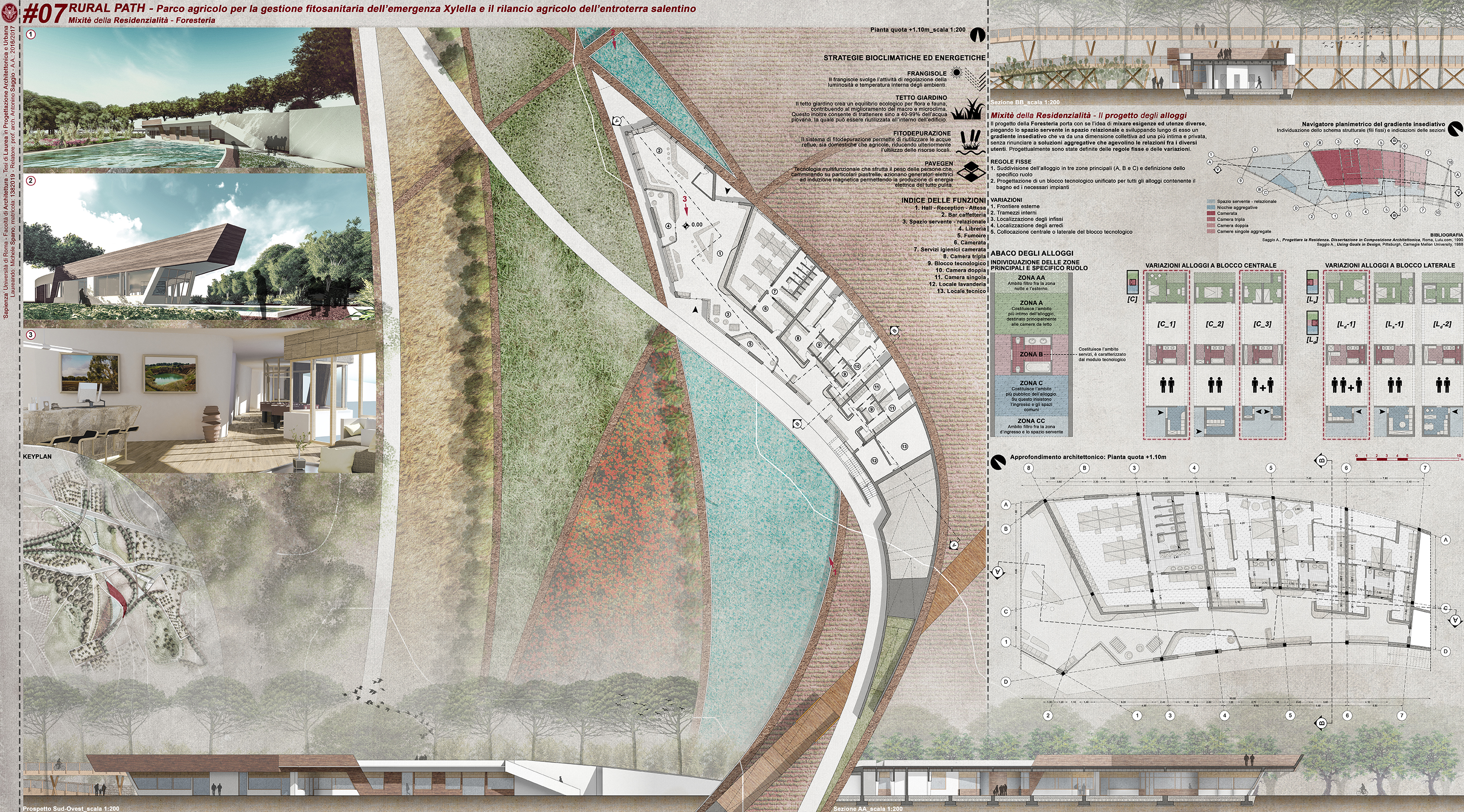 L'insieme dei percorsi rappresentano un vero e proprio diagramma, grazie al quale Rural Path si inserisce in ruoli diversi e interconnessi fra loro: Rural Path infatti è parco agricolo, dimensione tramite cui si valorizza il paesaggio locale a partire dalla natura rurale del sito; è infrastruttura sostenibile, dimensione possibile grazie ad un'attenta gerarchia dei flussi la quale, nel cercare di sostituirsi ai più convenzionali sistemi di collegamento, propone livelli di percorrenza sempre diversi, in grado di raccontare il luogo da molteplici punti di vista; è luogo della ricerca, laboratorio a cielo aperto finalizzato alla gestione dell'emergenza Xylella, all'interno del quale i percorsi costituiscono un sistema di lunghezze ottimizzato al fine di garantire una rapida ricognizione della salute ambientale del territorio. Il network di tracciati rappresenta, in ultima istanza, l'ossatura della struttura programmatica della proposta progettuale, in particolare nel suo relazionarsi con il territorio. Due parole chiave caratterizzano l'operazione: "Eco villaggio", ambito della sperimentazione del nuovo vivere rurale, e "Ricerca", appunto, ambito della sperimentazione agro ecologica e fitosanitaria, votato alla costruzione di un nuovo e condiviso know-how agricolo. I due aspetti rappresentano lo strato superficiale di una strategia ancora più complessa, che punta a combinare pubblico e privato all'interno di un sistema che si muove dal paesaggio all'architettura. Ecco allora che si vedono grandi campi agricoli alternarsi a distese boschive per l'agro - silvicoltura, estensioni floreali a specchi d'acqua per la fitodepurazione, oliveti ad aree ludico - sportive, ambiti fra i quali si muovono piste ciclopedonali, percorsi a cavallo e passeggiate in quota, forme di spostamento sostenibili capaci di regalare esperienze edonistiche del paesaggio salentino, qui riproposto in forme e linguaggio contemporanei.