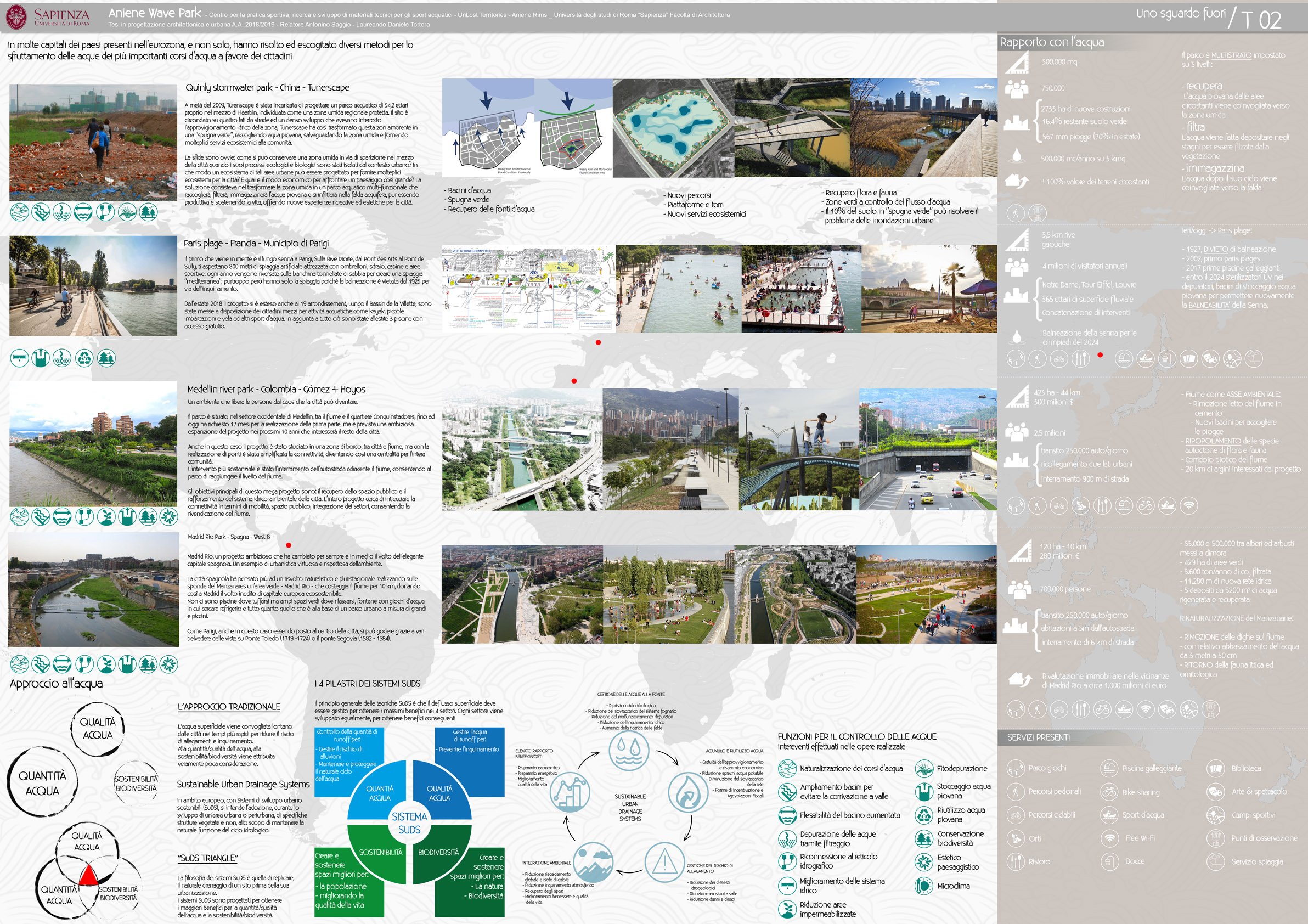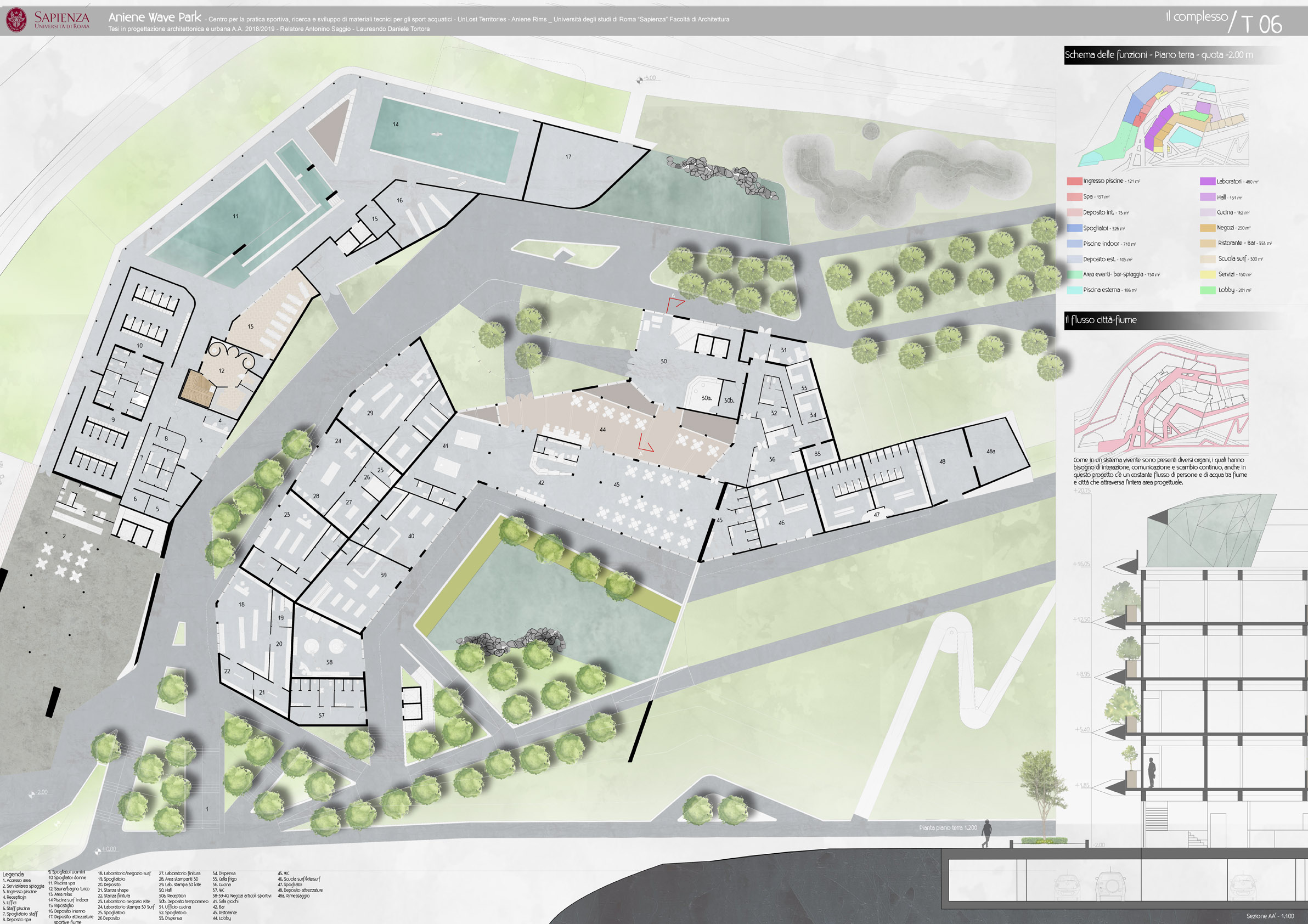 L'Aniene Wave Park nasce dalla necessità di ristabilire un legame tra fiume e città attraverso la rivitalizzazione delle rive abbandonate al degrado e in pa particolare attraverso l'uso dell'acqua come catalizzatore sociale. L'idea di un centro per sport acquatici nel centro di Roma viene dalla volontà di rendere più fruibile in particolar modo la pratica del kitesurf e del surf, sport che oltre che ad essere particolarmente in voga al momento, si prestano particolarmente al progetto in quanto necessitano di una preparazione a terra notevole. Il progetto nasce sulle sponde dell’Aniene, in zona Colli Aniene, una vasta area a ridosso del fiume in una zona particolarmente ventosa che può permettere ad atleti, appassionati o semplicemente a chi cerca una nuova avventura di vivere un’esperienza acquatica a portata di città risparmiando spostamenti inconciliabili con il poco tempo libero a disposizione e eliminando il rischio che, oltretutto, gli stessi spostamenti possano essere vani a causa delle avversità climatiche che caratterizzano la costa mediterranea. Il progetto è strutturato su 4 livelli: architettonico, tecnologico, ecologico e di marketing. La parte architettonica prevede la realizzazione di un complesso sportivo che ospiterà al suo interno piscine (agonistiche e ludiche), vasche con onde artificiali utili alla pratica del surf, ma anche adatte a testare delle attrezzature sportive prodotte in loco. L’aspetto tecnologico è il fulcro del progetto: sono presenti all'interno del parco dei laboratori di stampa 3D nei quali saranno realizzate attrezzature sportive (pinne, tavole, accessori, ecc.) a basso costo e a basso impatto ambientale L'aspetto ecologico riguarda sia la produzione in laboratorio che il parco. - Produzione Nei laboratori verranno usati prodotti ecologici, prodotti provenienti da materiali riciclati (abs, pla, pet ecc), prodotti provenienti dallo stesso centro per la realizzazione di tavole Eco Board che verranno usate come bandiere nella lotta contro l’inquinamento acquatico. - Il parco All'esterno della struttura sono previste le seguenti realizzazioni: a) Il biolago: una piscina naturale, uno specchio d’acqua balneabile ed ecosostenibile, dove le piante acquatiche e specifici microrganismi a loro associati sostituiscono l’uso del cloro. b) vasche per la fito-depurazione: sono delle vasche in cui sono presenti diverse varietà di canne le quali assorbono le sostanze inquinanti dall'acqua rendendola pulita, una tra queste il bamboo (che può essere potato ed utilizzato per le attrezzature - a km0) c) delle piazze d'acqua allagabili nei peridi piovosi così da recuperare l'acqua piovana attraverso l’utilizzo di cisterne sotterranee per lo stoccaggio e il riutilizzo della stessa per le utenze della struttura e per il suo controllo bioclimatico. Progetto di marketing L'idea principale è quella di creare un brand di tavole componibili sia per il surf che per il kitesurf che promuova la produzione “home made” e l’utilizzo di materiali ecosostenibili e/o riciclati.