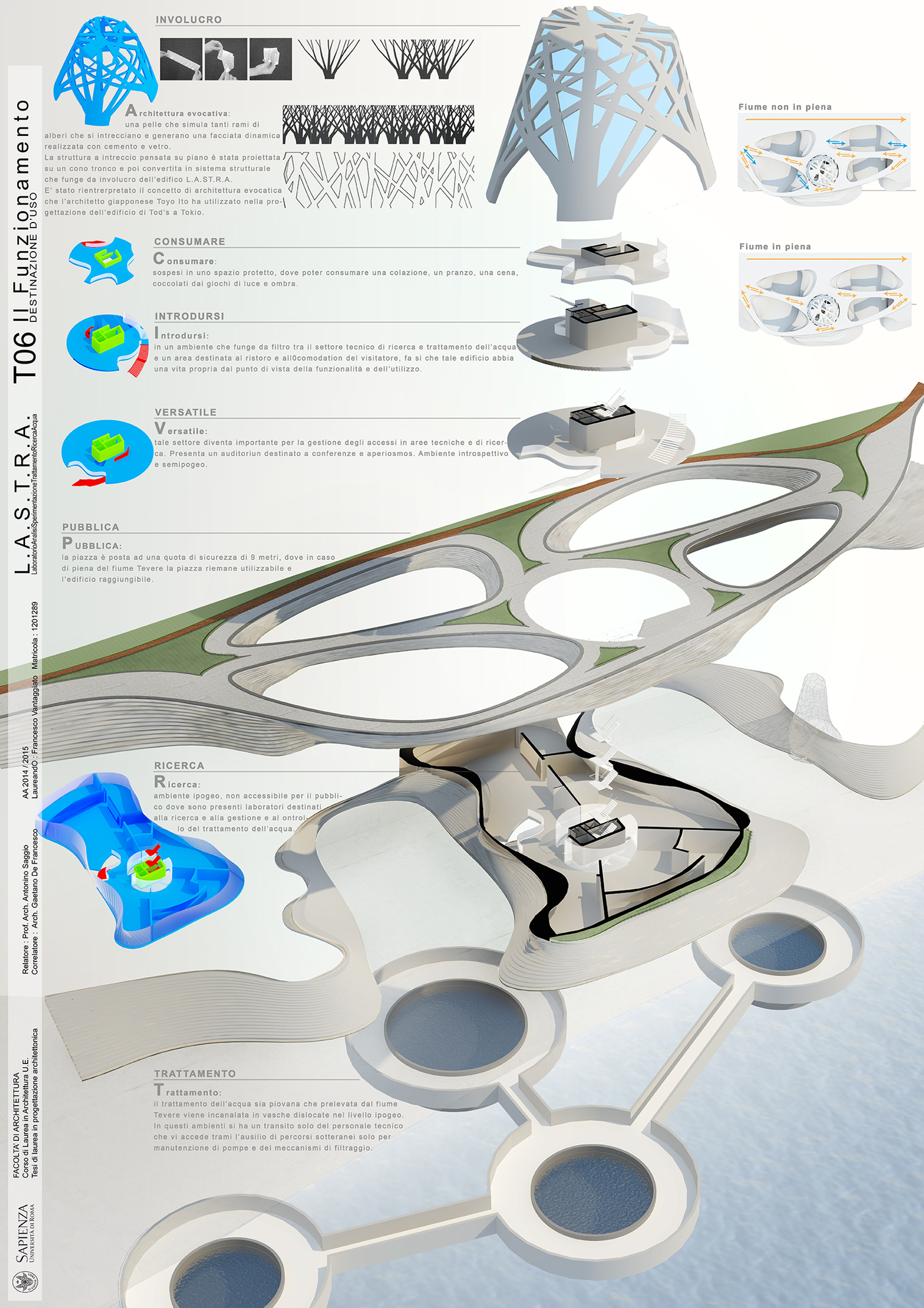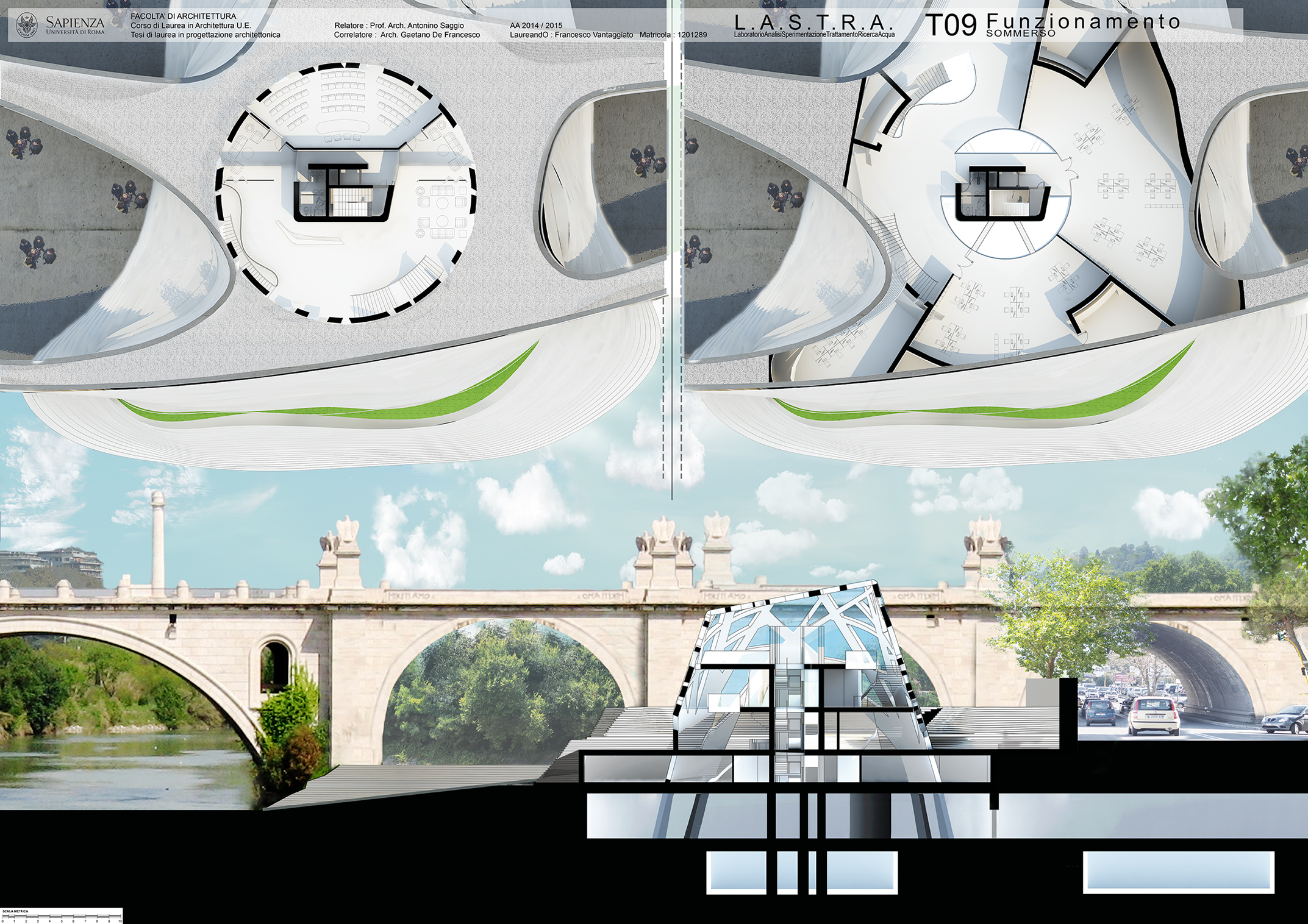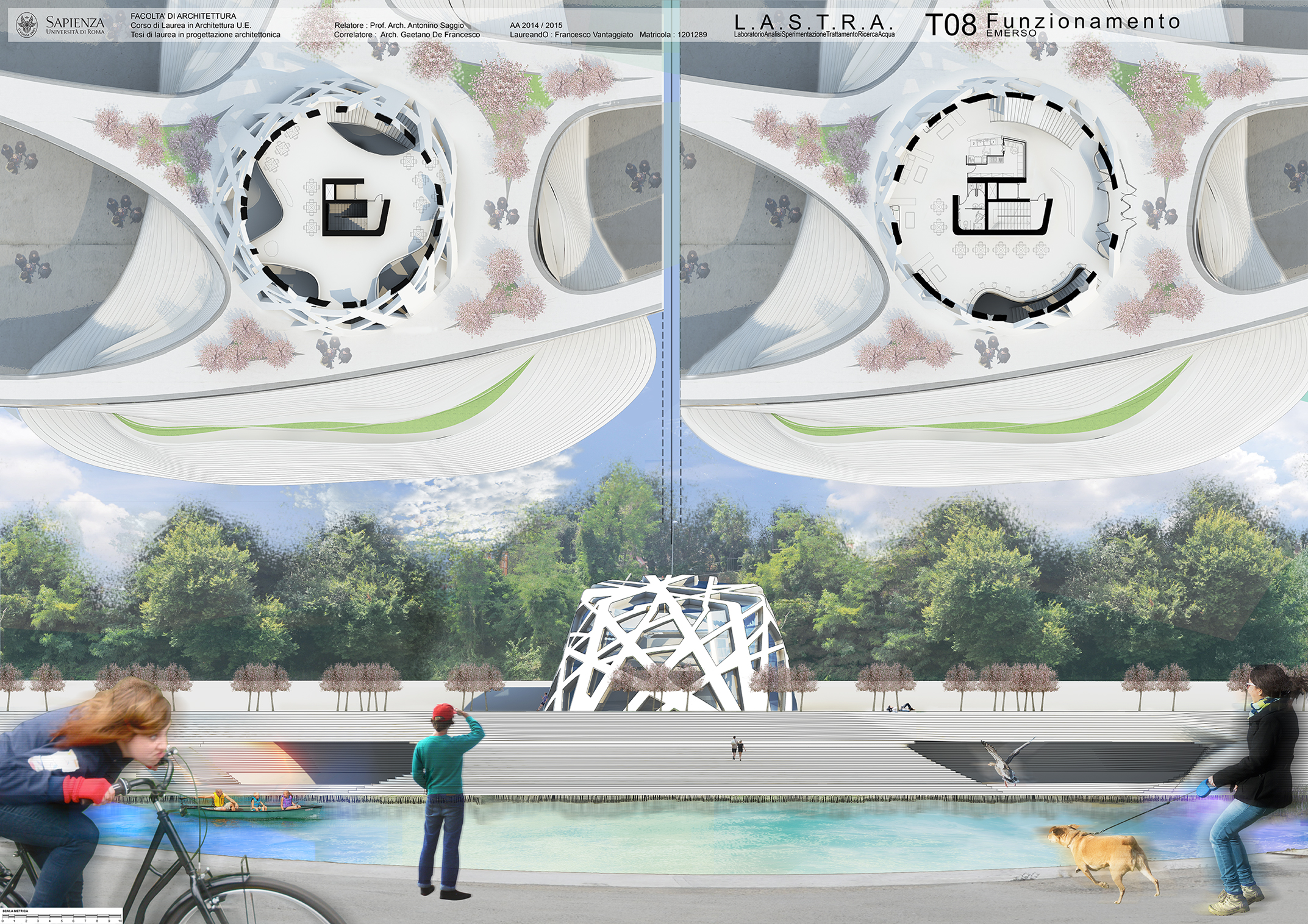 Questi aspetti e lo stesso enorme inquinamento del Tevere hanno condotto all’ideazione di un centro di ricerca e depurazione dell’acqua e alla sua localizzazione all’interno del PER nei pressi di ponte Flaminio come fattore anche promozionale ed educativo. L’intervento si è concretizzato primariamente con la creazione di una piazza posta a una quota di sicurezza (8 metri) dal fiume Tevere che consente l’accesso a L.A.S.T.R.A anche in situazione di piena. Gli spazi attorno al progetto sono ripensati e ridisegnati per fornire una valorizzazione di un’area naturalisticamente molto bella, ma oggi in profondo degrado e abbandono anche se questo settore di Roma negli ultimi anni sta vivendo una grande evoluzione socio-economica.