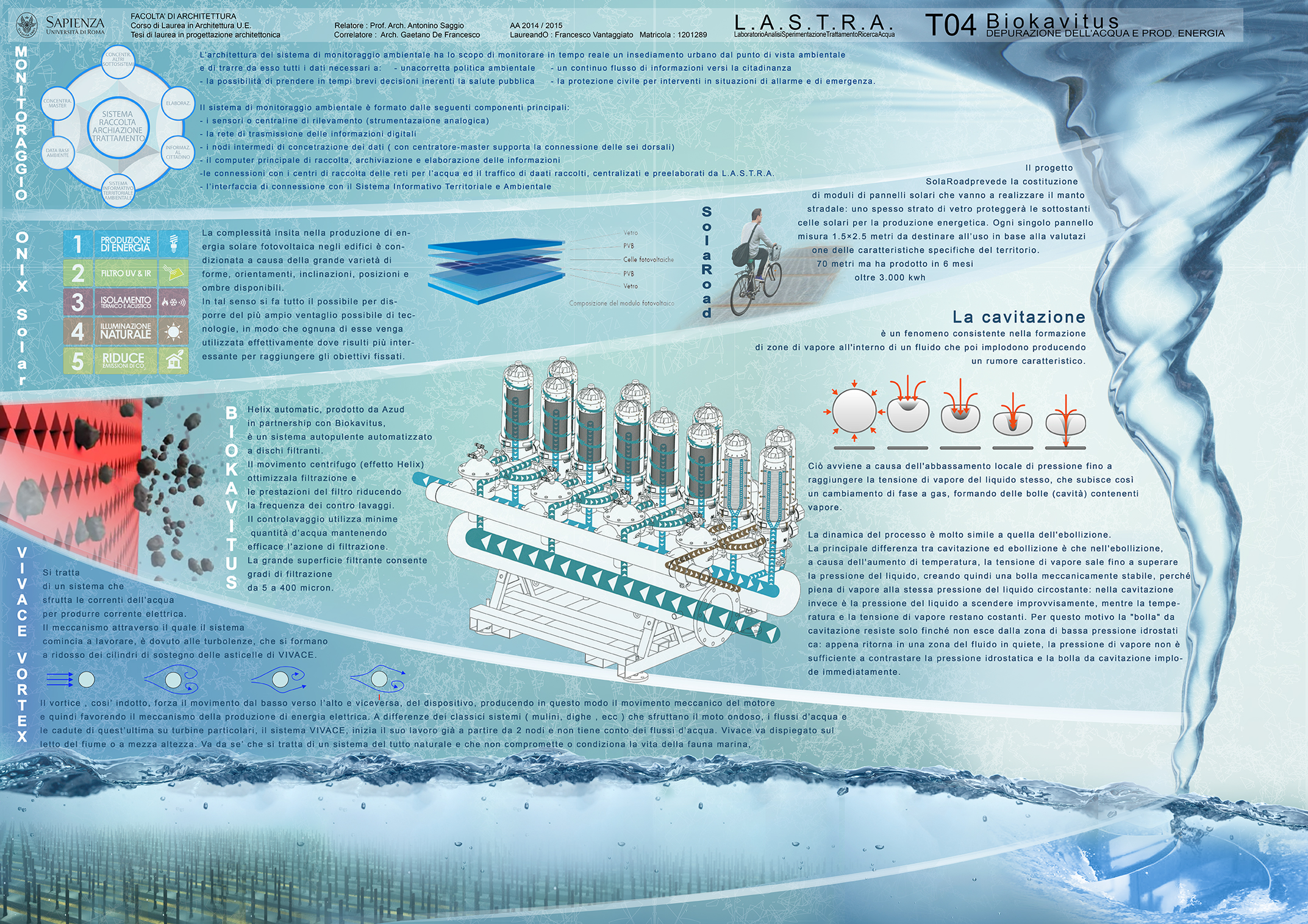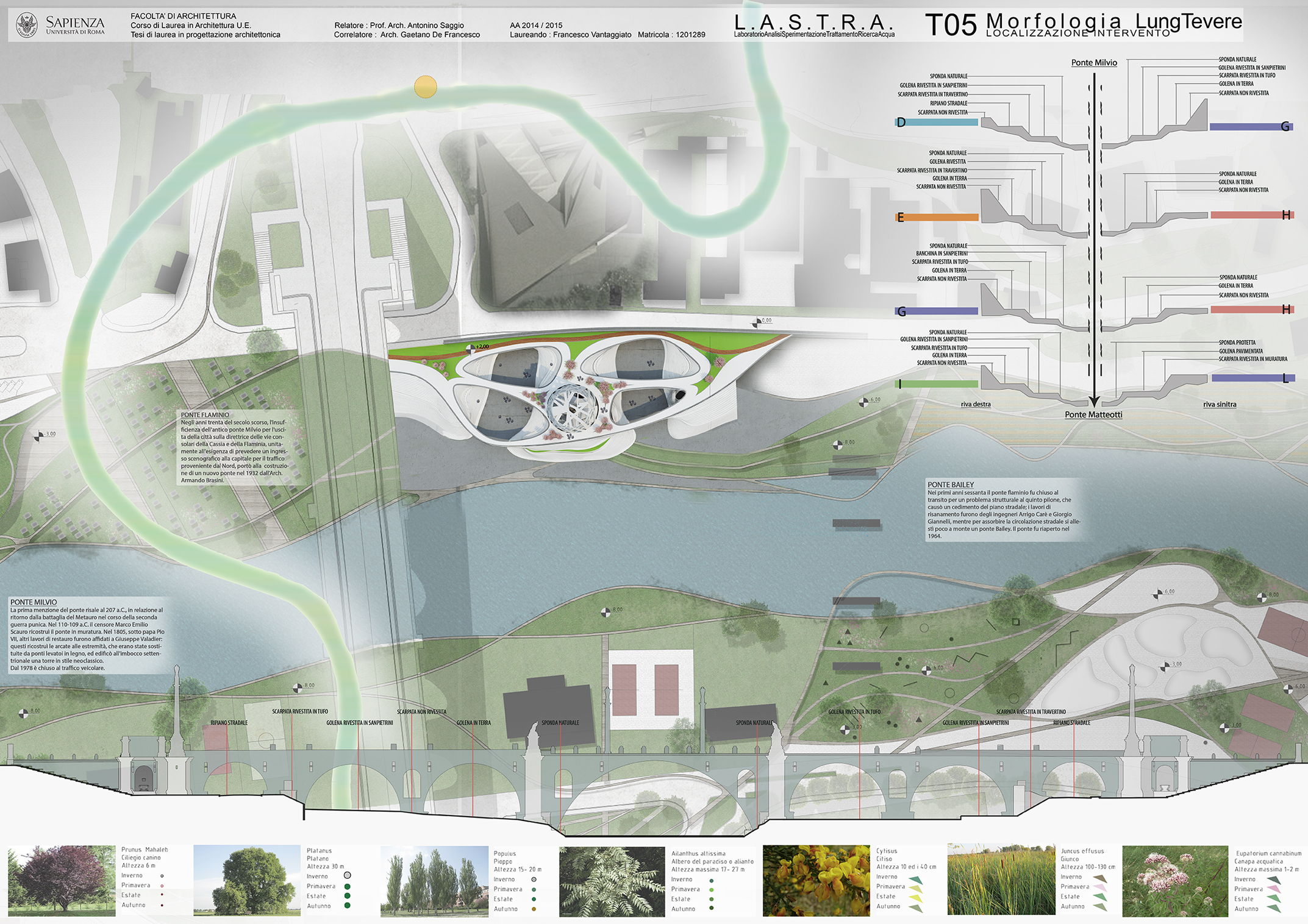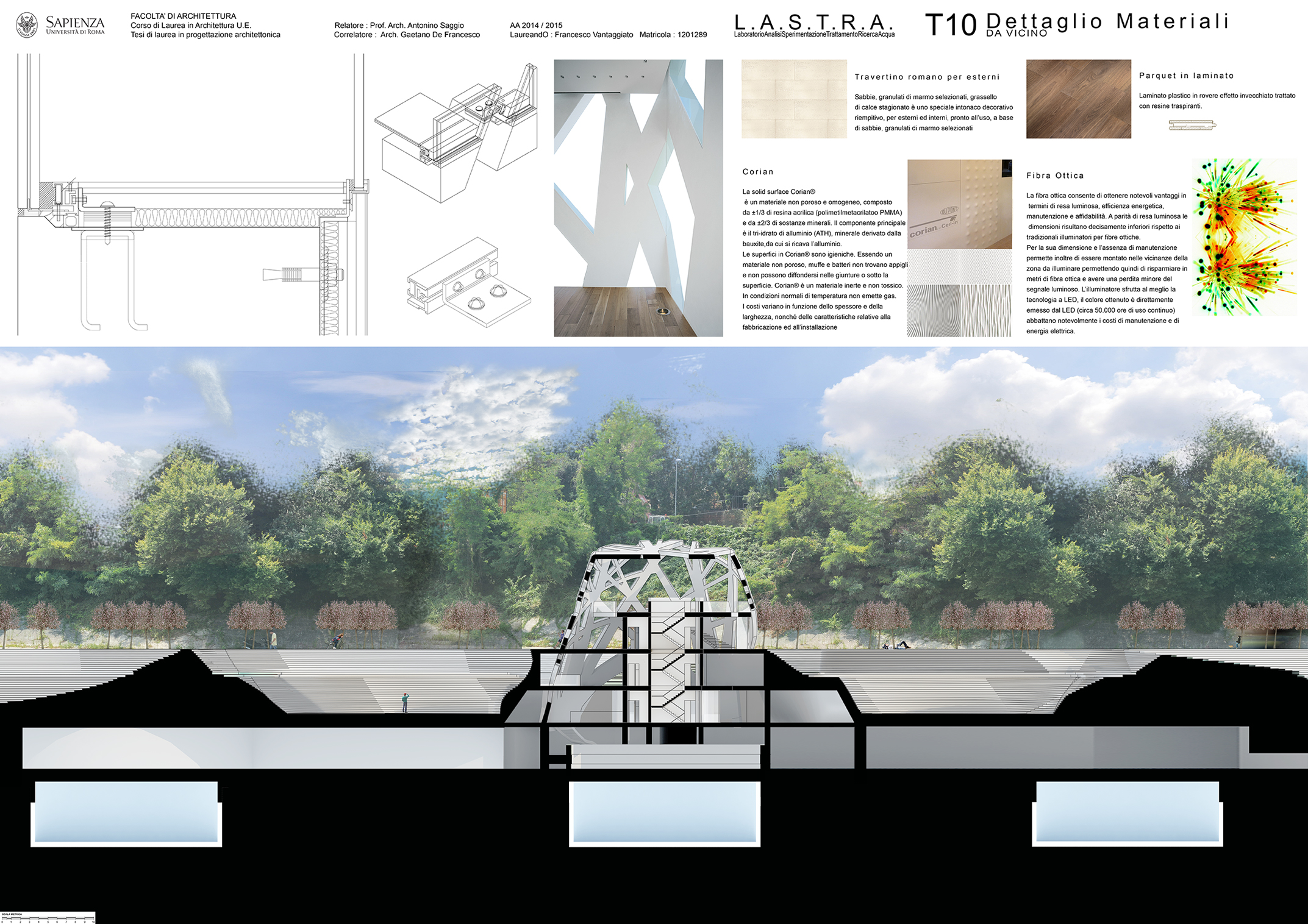 Questi aspetti e lo stesso enorme inquinamento del Tevere hanno condotto all’ideazione di un centro di ricerca e depurazione dell’acqua e alla sua localizzazione all’interno del PER nei pressi di ponte Flaminio come fattore anche promozionale ed educativo. L’intervento si è concretizzato primariamente con la creazione di una piazza posta a una quota di sicurezza (8 metri) dal fiume Tevere che consente l’accesso a L.A.S.T.R.A anche in situazione di piena. Gli spazi attorno al progetto sono ripensati e ridisegnati per fornire una valorizzazione di un’area naturalisticamente molto bella, ma oggi in profondo degrado e abbandono anche se questo settore di Roma negli ultimi anni sta vivendo una grande evoluzione socio-economica.