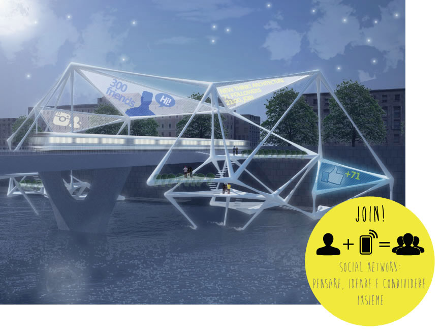 Luca Saccoccio Il progetto propone un nuovo modo di vivere la città. JOIN ME ha l'obbiettivo di divenire un vero e proprio social network ma questa volta non solo virtuale ma propriamente fisico, in grado di superare i limiti che le diverse piattaforme virtuali comporatano per uan comunicazione comunicazione in diverse modo tutta virtuale e tendenzialmente patologica. Il progetto vuoe creare un luogo in cui attraverso la tecnologia e la potenza degli strumenti interattivipossano divenire un ponte di collegamento tra le idee e la loro realizzazione fisica.
