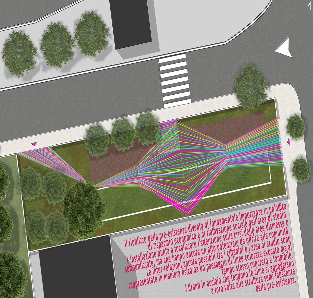 FIl percorso che ci ha portato alla concettualizzazione dell’installazione artistica è partito dalla nostra ferma convinzione che non esista uno spazio urbano, seppur sottoutilizzato o in stato di abbandono, che non sia in grado di offrire ancora qualcosa alla comunità. La sfida progettuale che pone in genere uno spazio abbandonato è quella di ridare slancio sociale e vivibilità allo spazio. In questo caso per noi la necessità dell’area di studio era quella di recuperare, oltre alla percezione visiva e funzionale, anche e soprattutto la vivibilità e la scoperta di un ambiente che evochi emozioni, al sicuro dal caos, in grado di generare energia, tramite movimento e linee di forza, ma al tempo stesso tranquillità. Queste componenti trovano forma e senso in uno spazio che sia contemporaneamente di connessione (tra le fermate dell’autobus), di attesa, di gioco e di riscoperta della natura. Le inter-relazioni ancora possibili tra i cittadini e l’area di studio sono rappresentate in maniera fisica da un paesaggio colorato, evocato nella cromia ma al tempo stesso concreto e tangibile nella frequenza delle cime che compongono l’installazione. I tiranti in acciaio che tendono le cime si appoggiano a loro volta alla struttura semi fatiscente della pre-esistenza. Il riutilizzo della pre-esistenza diventa di fondamentale importanza in un’ottica di risparmio economico. La concezione dell’installazione è stata portata avanti avvalendosi degli strumenti di progettazione parametrici (Grasshopper) e di modellazione 3D (Rhinoceros), in maniera tale da gestire concretamente (e non solo per ipotesi visive) le dimensioni e il numero complessivo delle cime colorate nonché dei cavi tiranti in acciaio.