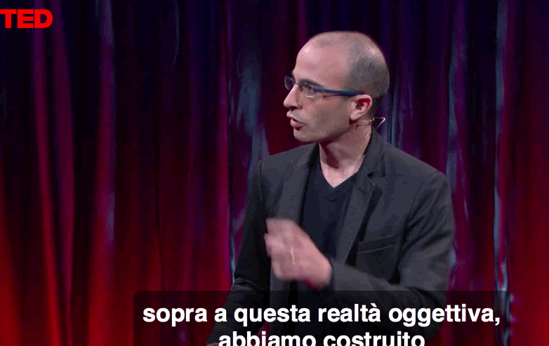 Andrea Ariano 2018 propone un video che sostanzia due questioni Gli umani sono gli univi a collaborare in grandi numeri e soprattutto sono gli unici in grado di costruire "sopra" una realtà oggetiva una realta fittizzia (che sicuramente noi chiameremmo convenzionale quindi basata sulle informazoni o meglio diciamo cosi su una sorta di dilatazione delle informazioni vedi il denaro) Noah Harari
