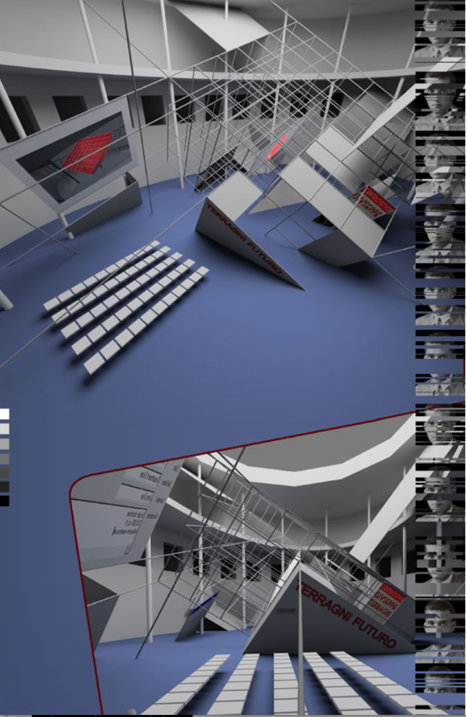 1°Livello_ Sail System. Siamo nel sistema della singola vela, che è come dire... a dimensione d'uomo, ovvero tridimensionale. Il funzionamento perfetto del sistema è dato dal funzionamento della struttura in questione e di tutte le attività che si svolgono in essa. Ovvero ogni vela per essere un oggetto socialmente utile (SUO = Socially Usefull Object, bello questo acronimo, non trovate?!) deve essere strutturalmente perfetta, e qui mi riferisco agli elementi costruttivi, alla struttura architettonica, in sostanza all'edificio-contenitore. In realtà ogni vela per essere un SUO deve anche essere in grado di svolgere una serie di attività per cui è chiamata tale, ovvero deve funzionare anche il contenuto dell'edificio. La Music_Sails dovrà permettere l'ascolto di musica tramite cabine, sale dotate di impianti per l'ascolto di musica, in gruppo o singolarmente. Essadovrà inoltre permettere la creazione di musica tramite sale d'incisione insonorizzate; e così via. La Reader_Sails dovrà permettere la lettura di diversi tipi di testi, l'interpretazione e il commento dei testi da parte di gruppi di perone, dovrà permettere lo svolgimento di conferenze. La Technology_Sails dovrà permettere, dotata degli strumenti adeguati, lo svolgimento di attività attinenti l'insegnamento della Information Technology, dovrà permettere l'utilizzo di strumenti tecnologici. Ogni sistema, a questo livello, è autonomo rispetto agli altri. 2° livello_ iWeb-Sails System. Si passa ad un sistema superiore in cui sono contenuti i tre sistemi inferiori delle tre vele e quello dell'area esterna ad esse. Questo sistema non funziona se non funzionano i quattro subsistemi e se questi non interagiscono tra loro. continua http://digilander.libero.it/mary.rag/ConceptApprofonditoConTempo.html Il vu tu di Calvino e un ragionamento sulla cornice Alessandra cao 2006