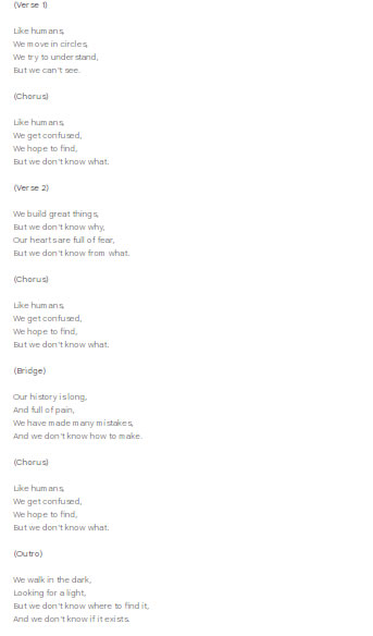 Il testo della canzone è pieno di immagini evocative che sottolineano la complessità e la fragilità della condizione umana. In particolare, la metafora del cerchio è ricorrente e rappresenta il senso di ripetitività e stagnazione che spesso caratterizza la vita umana. La canzone si conclude con un senso di speranza, ma anche di incertezza. Gli umani sono creature che camminano nel buio, alla ricerca di una luce, ma non sanno se esiste. Interpretazione La canzone "Like Humans Do" può essere interpretata in diversi modi. Un'interpretazione possibile è quella di una riflessione sulla natura della conoscenza umana. Gli umani sono creature consapevoli, ma la loro conoscenza è limitata. Spesso ci muoviamo in cerchio, senza riuscire a vedere oltre le apparenze. Un'altra interpretazione possibile è quella di una riflessione sulla condizione umana in generale. Gli umani sono creature complesse e contraddittorie, che spesso si sentono smarriti e incapaci di trovare un senso alla propria vita. In conclusione, "Like Humans Do" è una canzone che invita l'ascoltatore a riflettere sulla propria condizione umana, con tutte le sue contraddizioni e le sue fragilità.
