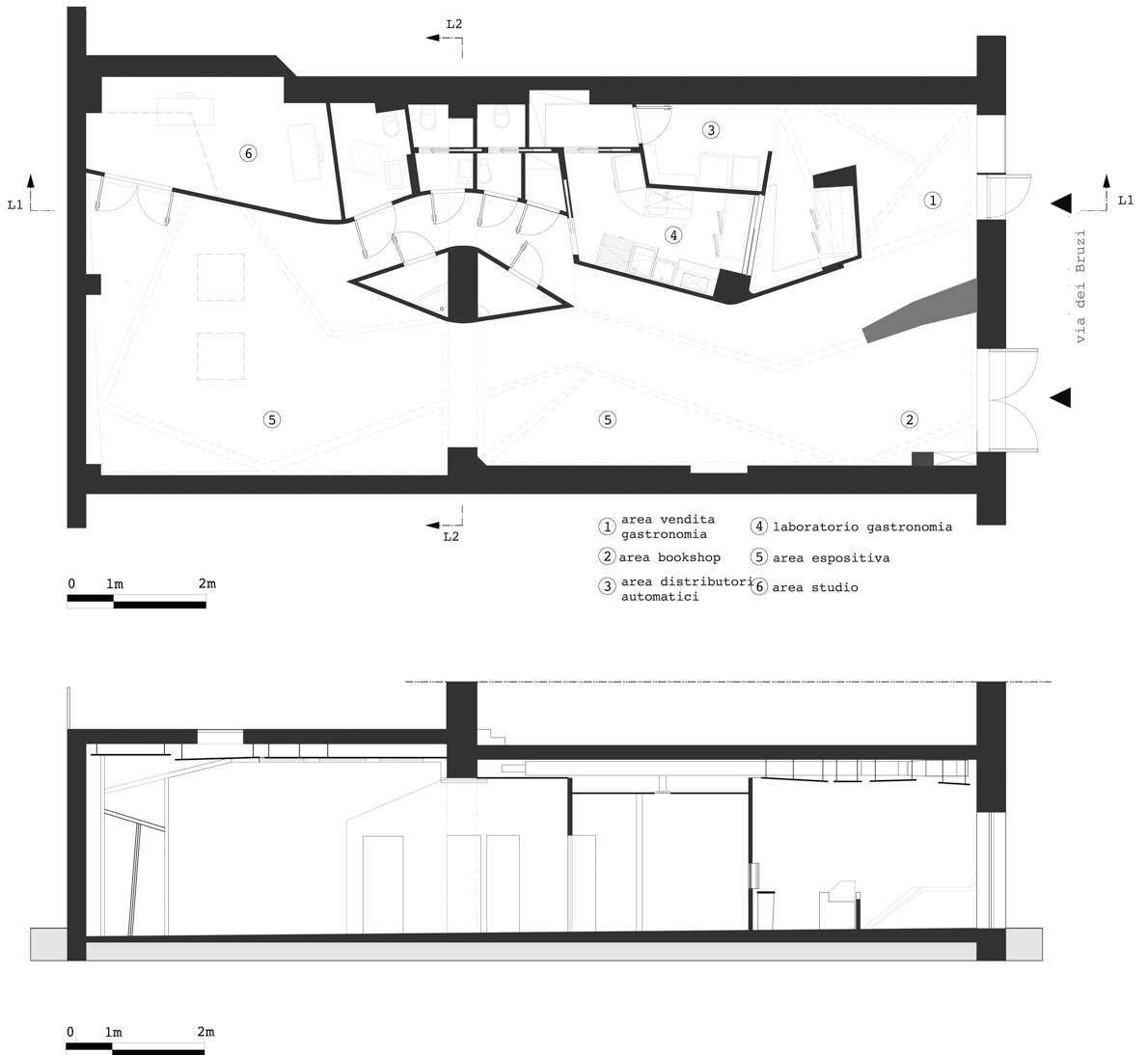 E4. Schematizzazione delle zone serventi e servite al 500 come fosse una macchina! elementi di distribuzione e energetici (cioè servizi da quelli igenici a tutti di vario tipo)