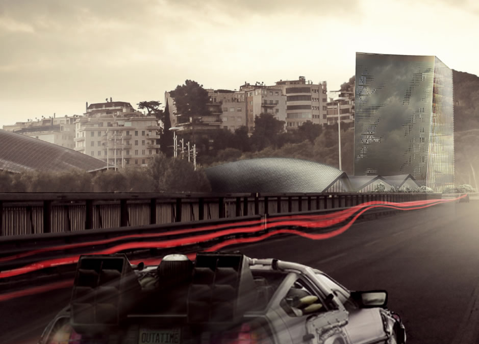 G5. FOTOMONTAGGIO del progetto nell'area di UNLOST TERRITORIEs realizzato con grande cura. Disegno chiave fondamentale dell'intera presentazione.