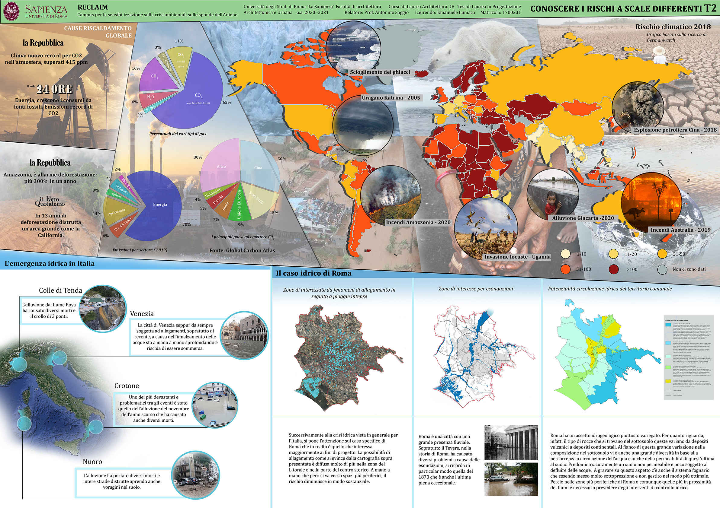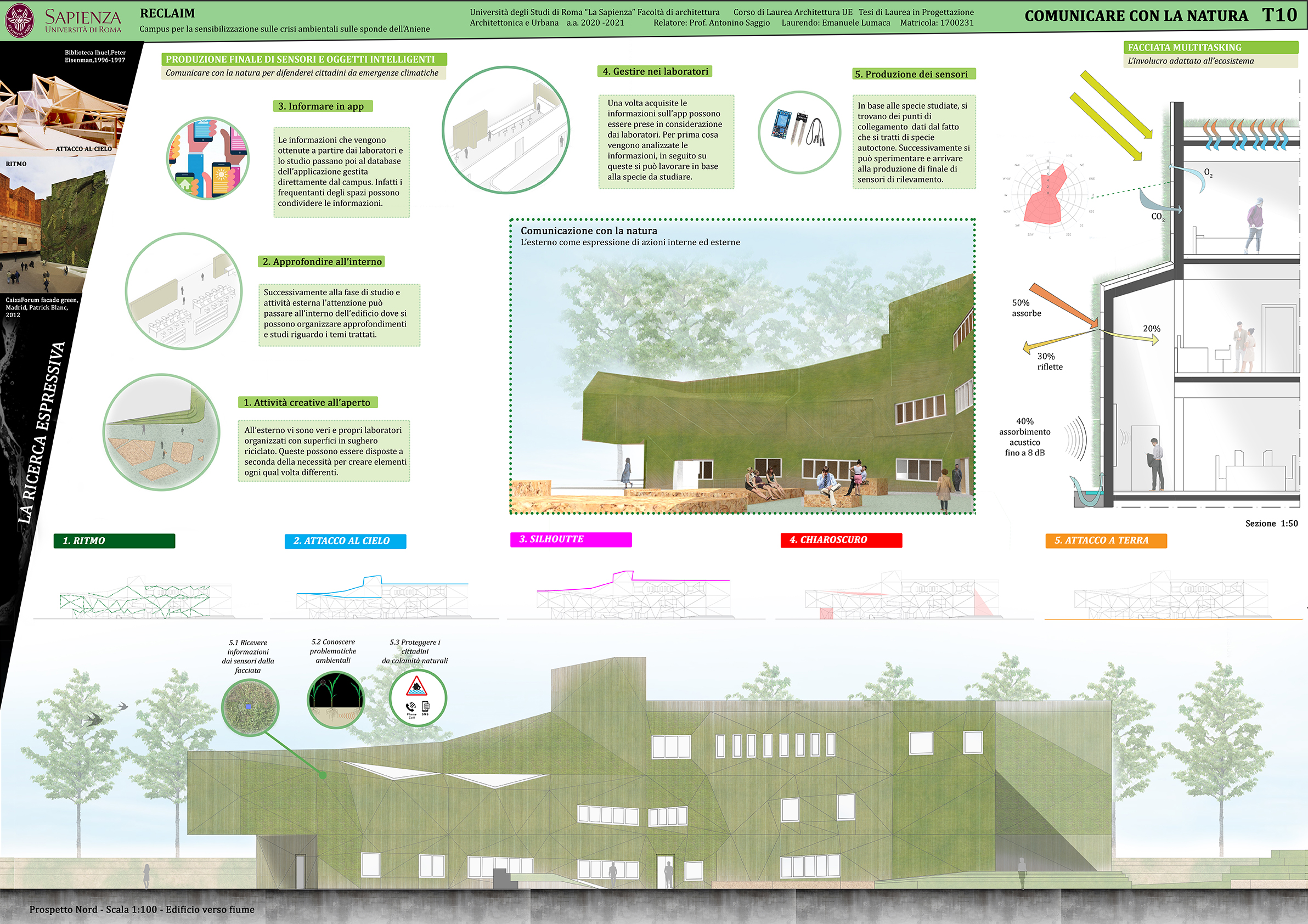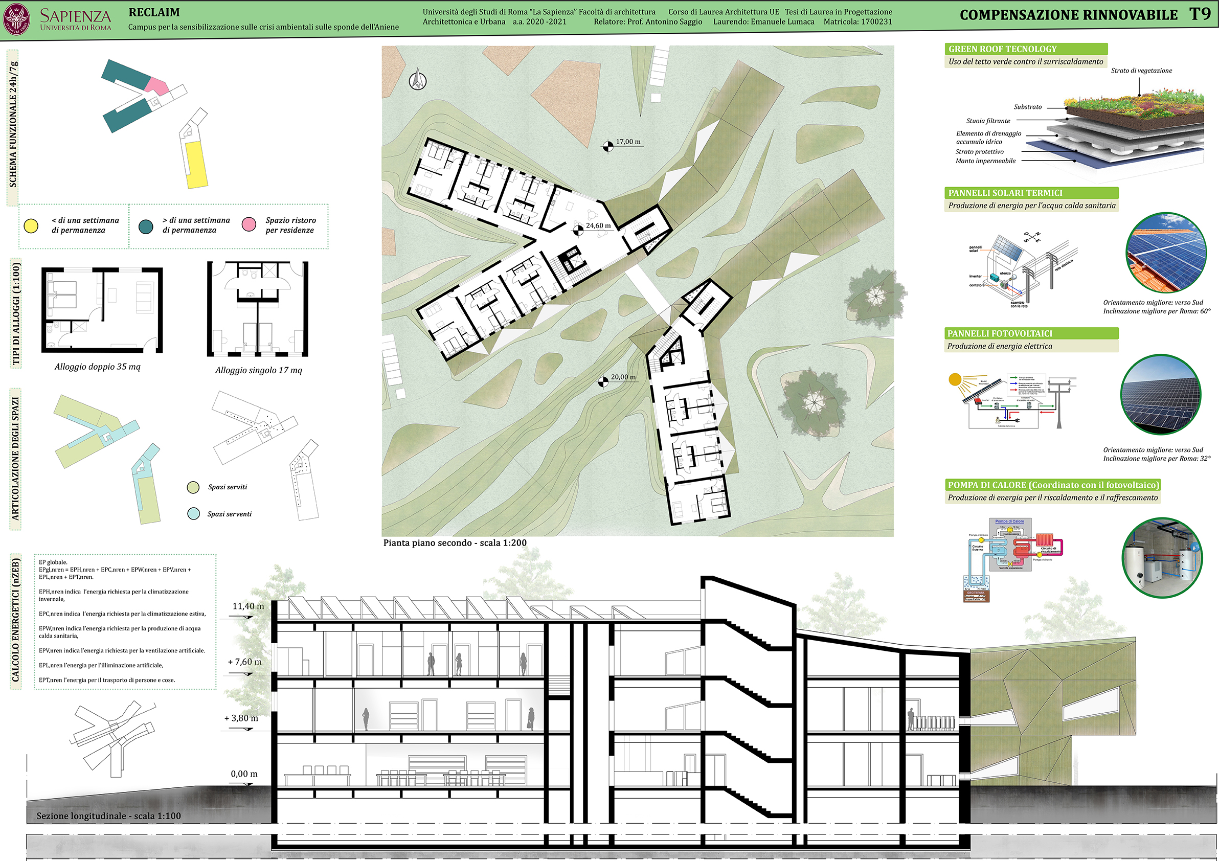 Il progetto si pone come occasione di “disinquinamento” attraverso il suo stesso programma funzionale, elaborato con il supporto di una lunga conversazione con il dr. Raniero Maggini presidente del WWF Roma e area metropolitana, con la creazione di un piccolo campus per “La sensibilizzazione sulle crisi ambientale sulle sponde dell’Aniene”. Oltre alle zone all’aperto si prevede un piccolo edificio nella parte meridionale con laboratori, aule di studio, auditorium, coworking, libreria sul tema. L'edificio è costruito con modalità molto attente al consumo energetico nZEB (nearly Zero Energy Building) con particolare attenzione alle trasmittanze dei pacchetti che definiscono l’involucro edilizio e il fabbisogno energetico soddisfatto dalle energie prodotte tramite fonti rinnovabili. La modesta cubatura, il cintrollo idrico, la funzione ambientale e disinquinante di Reclaim rappresentano nel loro insieme caratteristiche congrue con le indicazioni di Piano Regolatore.