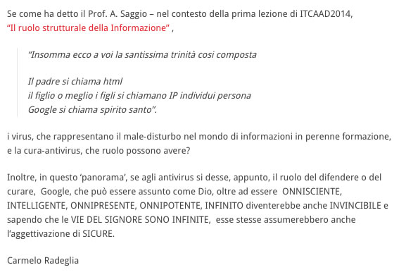 Per esempio ho riletto una lezione (quella di Internet) ed è ricca di parecche cose che io non ho detto. Per esempio un'altra formula di internet!!!!!!!! Gooogle che va di pari passi con la mia analogia google-Dio