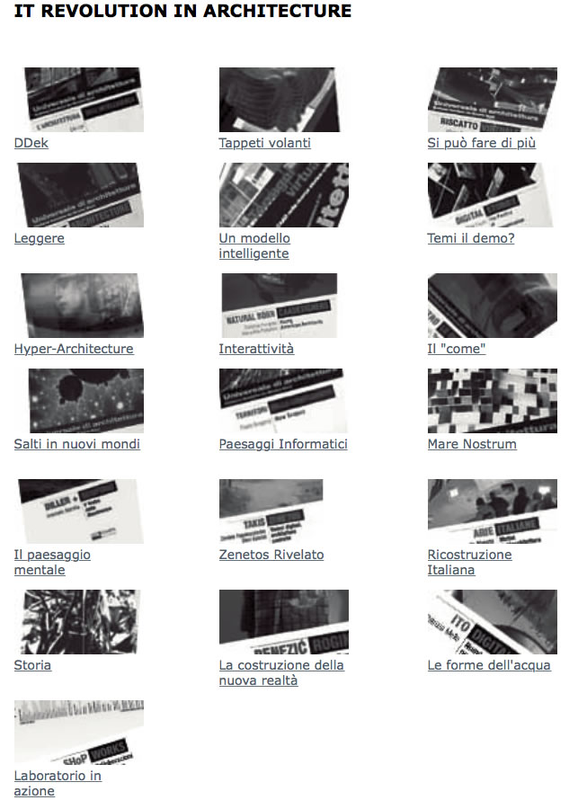 B. Aggiornare o Scrivere nel vostro sito un Concept UnLost Line attraverso una reinterpretazione, un'idea un suggerimento che può essere derivato dalla lettura del testo di cui avete fatto la recensione, oppure dalla lettura del volume Introduzione a la Rivoluzione Informatica in Architettura che immagino tutti stiate leggendo parallelamente allo sviluppo delle lezioni, oppure rispetto ad altre considerazioni ed esperienze. Tecnicamente si tratta solo di due o tre paragrafi al massimo che dovrebbero già avere un titolo (concettuale) e un sottotitolo (esemplificativo). Potete anche scorrere le esperienze dei corsprecedenti nella sezione finale >>, sia in quella delle presentazione intermedie per attivare alcune riflessioni ulteriori. Il concept inziale verte specificatamente su una situazione di CRISI o al Contrario su un forte DESIDERIO. Riflettendo in questi giorni sul tema delle crisi pensavo che un grande patrimonio di crisi aperte in ITALIA sono quelle delle condanne che ha avuto l'Italia da parte della UE.. Magari ci danno uno spunto interessante!!!! Questo è solo un primo link.. approfondendo sono sicuro se ne possono trovare di interessanti. Questo concept potrà rifluire con quelli degli altri in successvi progress. Potete pensare per esempio a come da questo punto di vista la UnLost Line potrebbe funzionae C. Eseguite in photoshop o in un altro programma raster un "Autoritratto della crisi". Non intendo dire naturalmente un macerato autoritratto stile neo-post espressionista o romantico. Intendo dire: tentare di rappresentare graficamente il tema d'anno sulla UNLost Line. Naturalmente potete basarvi su quanto fatto già nel concept o se volete, cambiandolo e facendo una nuova iterazione del concept in chiave grafica. Vi è una grande tradizione degli autoritratti del corso, per alcuni può essere utile vederli, per altri di voi può essere controproducente. Decidete voi >> . D.TUTTO Verrà presentato in forma seminariale, DIRETTAMENTE DAL VOSTRO BLOG (o sito se lo avete). QUESTA presentazione RAPPRESENTA UNA CONSEGNA INDIPENSABILE. ON or OFF. Simbolicamente vuol dire essere nel corso, ed esserlo con il proprio blog. Se non ci potete essere per ragioni di forza maggiore il vostro blog sarà presentato da un vostro colelga che nominerete .. chiamiamolo in gergo l'alias.. Il blog naturalmente conterrà anche almeno tre approfondimenti rispetto alle svolte sino a qui E. Leggi - Se vuoi - "Il Coraggio di Aprirsi" si tratta di un articolo ormai di molti anni fa, scritto più o meno contemporaneamente al manfesto "nuove sostanze" che avete letto. direi che la lettura è opzionale in questa fase.. ma magari ad alcuni può pensare a quanto scrivevo nel 2000 e l'oggi... |