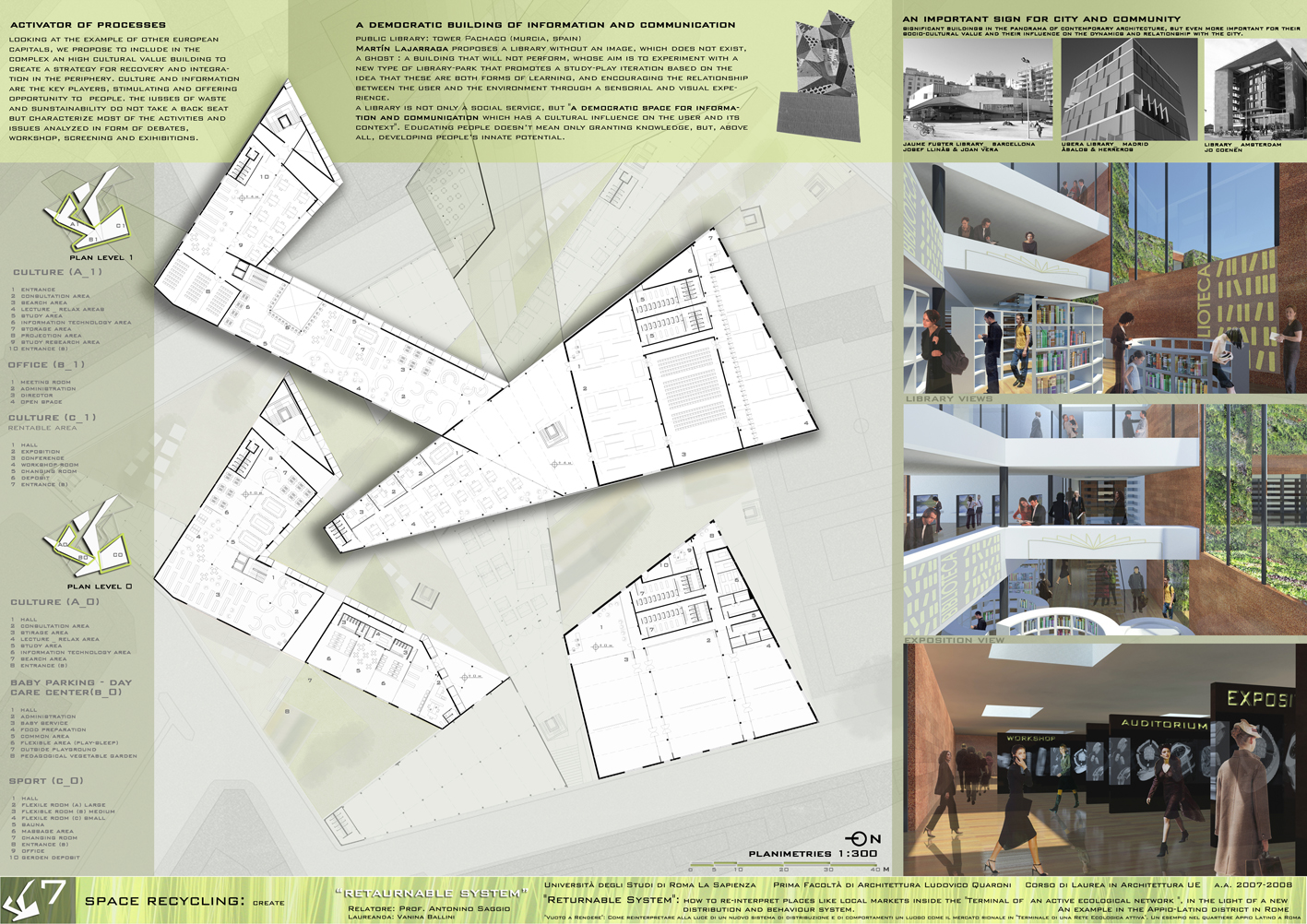The idea that the market can also create a urban junction and influence a number of areas that are close to it, pushes us to create a system of powerful connections between public spaces and green areas in which to activate processes of a deep "urban recycling" transforming the new centre in a catalyst building. Reading the project on an infrastructural level leads us not only to the resolution of one single part of the city, but of its relationship with the urban network working on global flows and processes. (text by V. Ballini)
