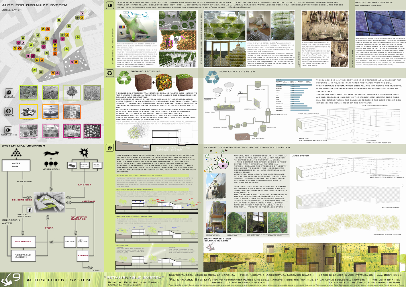 The "new centre" is to live as an "autonomous system" respect to the city, able to manage and process the waste materials, converting them into resources, to recycle rain and grey water, and to produce energy through natural systems and "eco-machines".