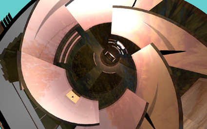 L'evoluzione al Signore si identifica nella punta del campanile, ad essa si contrappone l'area terrena, fortemente ancorata al suolo, che coincide con la parte bassa dell'ala dei percorsi e con la sala polifunzionale, (Tav. n° 3-5-9) dalla quale fuoriescono le strutture che raggiungono il suolo su monolitici elementi di incastro. La sala polifunzionale, strutturalmente indipendente, ospita una sala per incontri, cerimonie o ricorrenze, la biblioteca, l'aula didattica e si interseca con l'ala dei servizi generando gli spazi della sala svago, della palestra che affaccia sulla piscina, dell'area per gli hobbies ed i servizi.