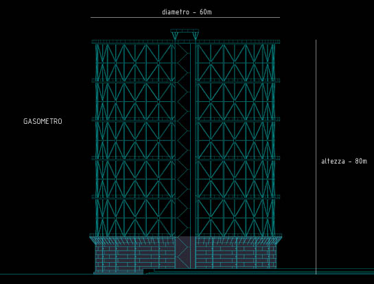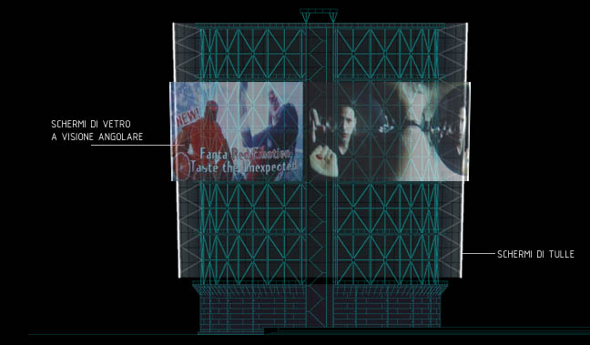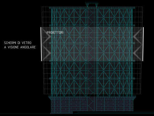 Da una prima idea che era quella di rivestire integralmente il gasometro con schermi costosi e pesanti, viste le dimensioni di questa struttura si è pensato a differenziare le proiezioni con due sistemi diversi: per ridurre drasticamente i costi e per alleggerire sensibilmente il peso e l'impatto sulla struttura stessa del gasometro.