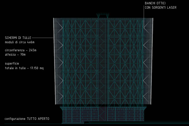 - TUTTO APERTO : l’intero gasometro è rivestito di tulle, e diventa quindi un enorme superficie sulla quale vengono proiettate con i laser, immagini, testi, ecc.