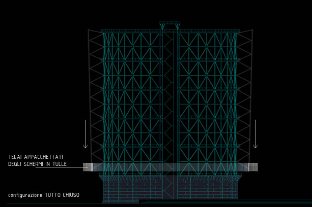 L’intero cilindro del gasometro viene dotato di un sistema che tramite binari verticali, fa scorrere telai leggeri (in carbonio o alluminio) per gli schermi in tulle.Possibili configurazioni :