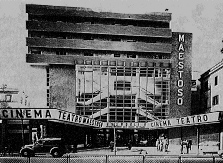 Il lavoro sulle sale di spettacolo ha il suo più importante episodio nella realizzazione del cinematografo Maestoso sempre a Roma della metà degli anni Cinquanta. Si tratta di un edificio pluriuso di 50.000 metri cubi che rappresenta lo stato dell’arte tecnologico del momento. E’ un cinema da 2600 persone, sei abitazioni superiori, sale sotterranee per intrattenimenti e due braccia ad un piano per bar e tavola calda. L’insieme funziona da condensatore pubblicitario e commerciale in una periferia cresciuta tutta con le regole di una feroce speculazione. Morandi opera con schiettezza sulla diversità delle funzioni. Crea un pacchetto di abitazioni superiori rigorosamente seriali e rivela la funzione pubblica portando in facciata la scala del cinematografo visibile attraverso il vetro dei pannelli. L’interno del cinema è un canto strutturale di piedritti a sezione variabile che fanno viaggiare i pesi orizzontali delle balconate a sbalzo sino al loro punto di scarico. Ma l’intera costruzione è caratterizzata principalmente da sei portali zoppi che partono dall’atrio e, attraverso i 40 metri della sala, vanno a poggiare su un traverso che contiene lo spazio scenico. L’intera costruzione, compresi i tre piani di appartamenti superiori, risulta sostenuta da questo enorme telaio. Tecnicamente l’opera sfrutta il principio della precompressione alla quale Morandi ha attivamente lavorato sin dagli anni della guerra realizzando anche sette sistemi brevettati per la tensione dei cavi di acciaio.