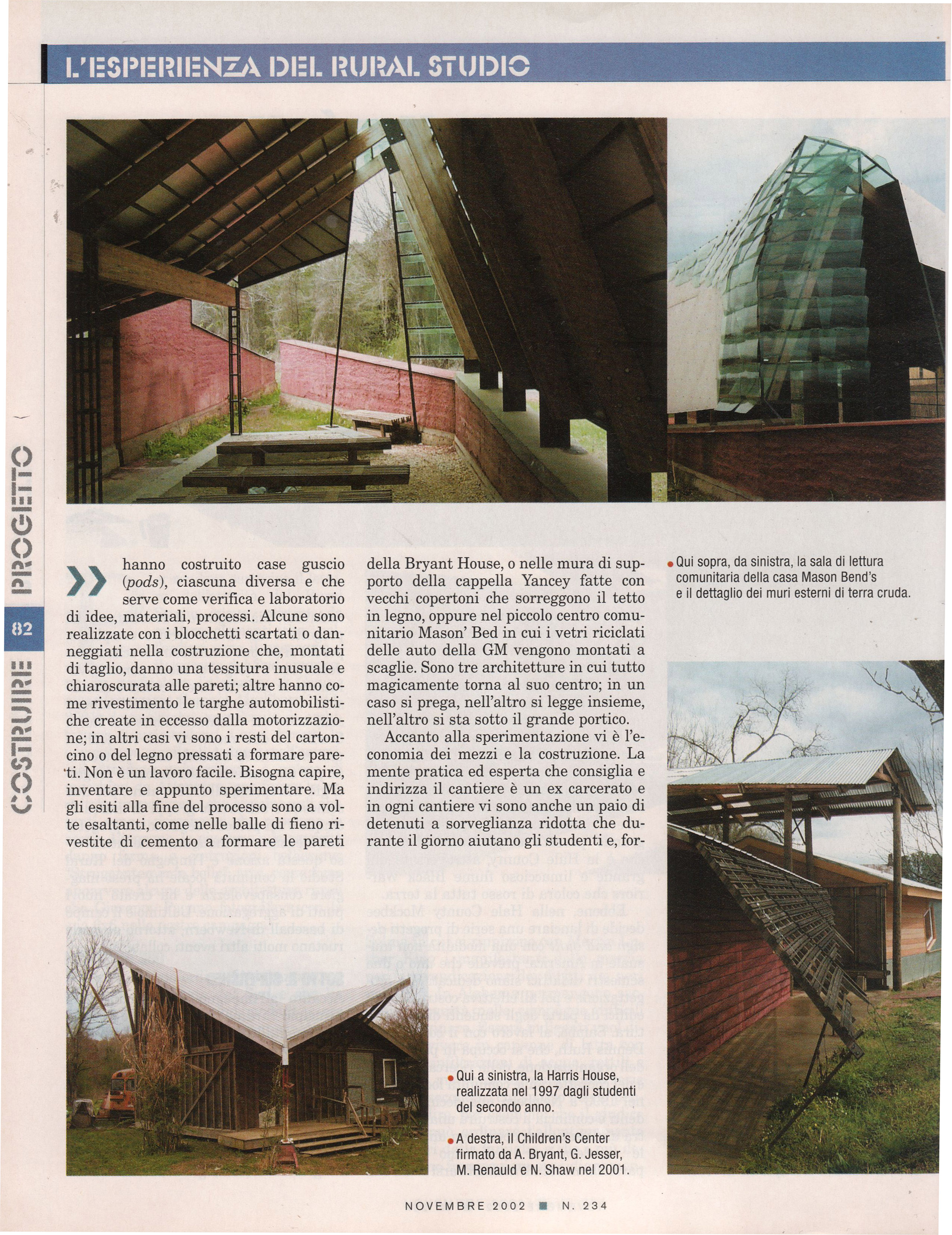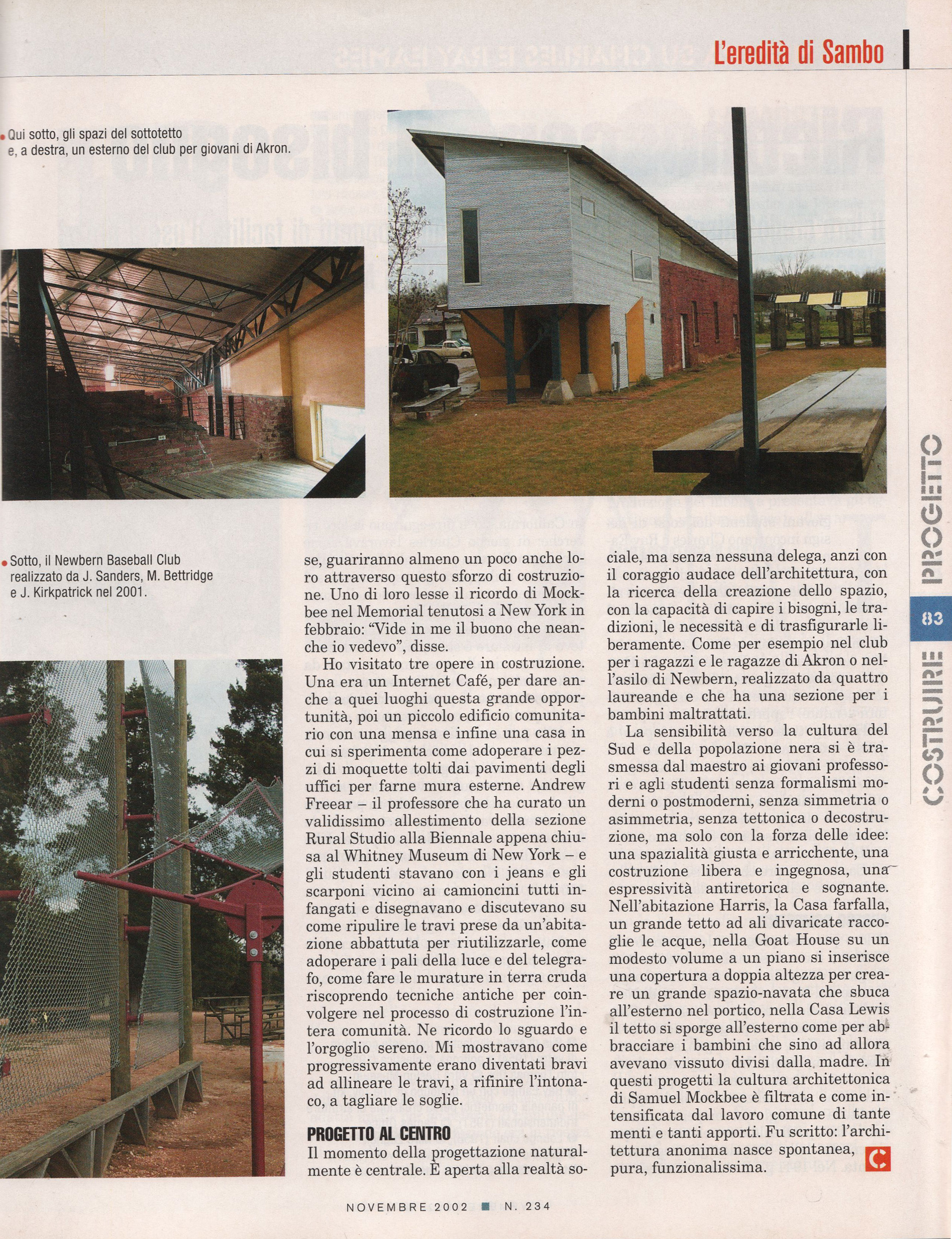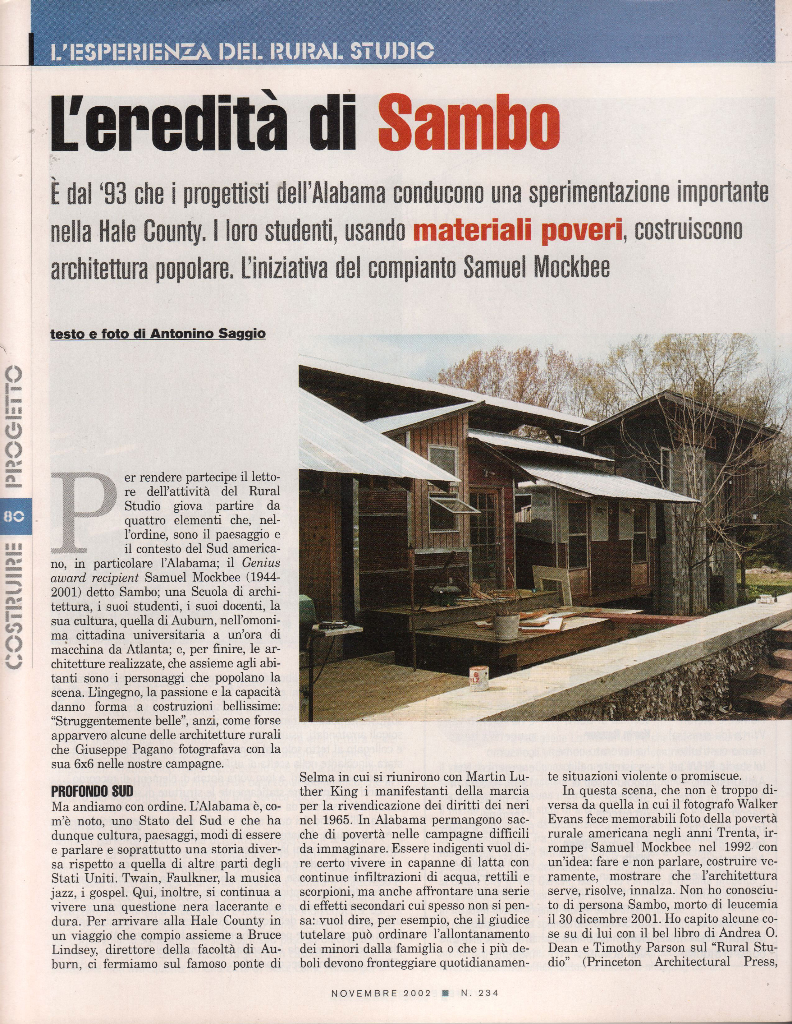 Articoli Rubrica semestrale sul mensile "Costruire"dal 1999 al 2002 SAMUEL MOCKBEE il RURAL STUDIO Costruire, n. 234, Novembre 2002 on line "Arch'It"