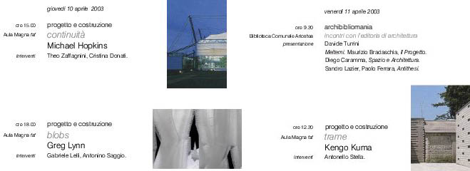 Cicli di incontri e tavole rotonde e alcune Conferenze per il decimo anniversario della Facoltà di Architettura di Ferrara. Tra l'altro segnaliamo il 10 Aprile alle 18 Greg Lynn, introdotto da G. Lelli e con un commento di A.S. e l'11 Aprile una tavola rotonda tra le riviste di architetture con tra l'altro Anithesi e il Progetto. Presso La Facoltà di Architettura, via Quartieri 8, Ferrara.