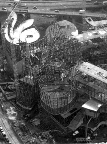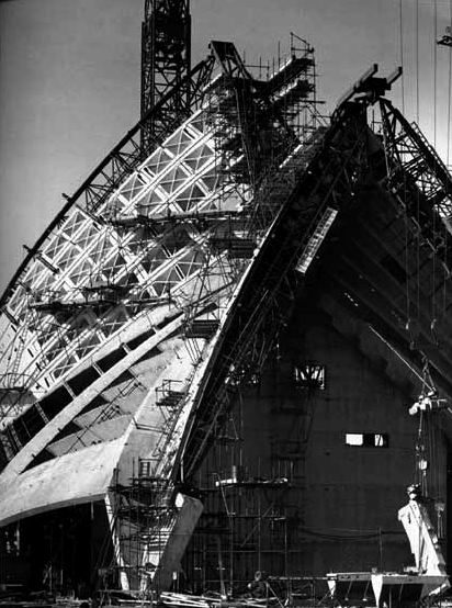 " Utzon elabora le sue soluzioni scegliendo un imprenditore con cui ricercare insieme la soluzione migliore: progettazione strutturale e costruzione sono un fatto coesivo ed è quindi impossibile mettere in gara d'appalto la costruzione. Le proteste degli industriali innome della libera concorrenza, insieme al cambiamento del quadro politico, sono tra le cause principali del suo allontanamento dalcantiere. L'idea di realizzare industrialmente non la ripetizione seriale di Mies ma i propri sogni entra in crisi nella realtà politica ed economica degli anni Sessanta ma trenta anni dopo, Gehry realizza con successo il Museo Guggenheim di Bilbao. Mentre Utzon doveva cercare una razionalità geometrica delle forme per poterle disegnare prima e realizzare industrialmente poi, grazie all'avvento del computer qualunque forma può essere rappresentata e le diverse imprese in gara proporranno ciascuna il proprio sistema per realizzarla. Vicini al duemila nonsolo l'immagine risulta svincolata dalla funzione, ma anche la costruzione è diventata autonoma. "
