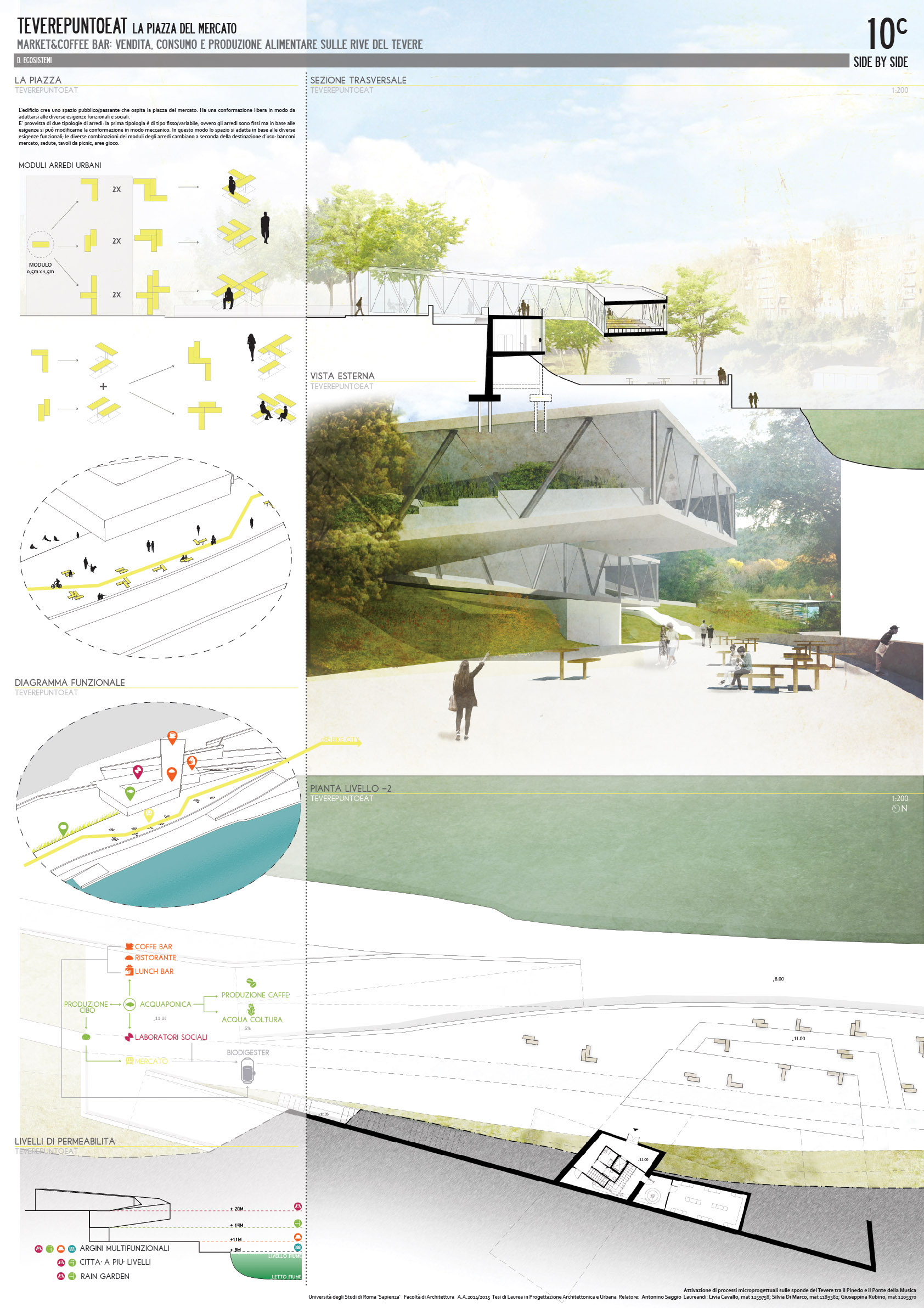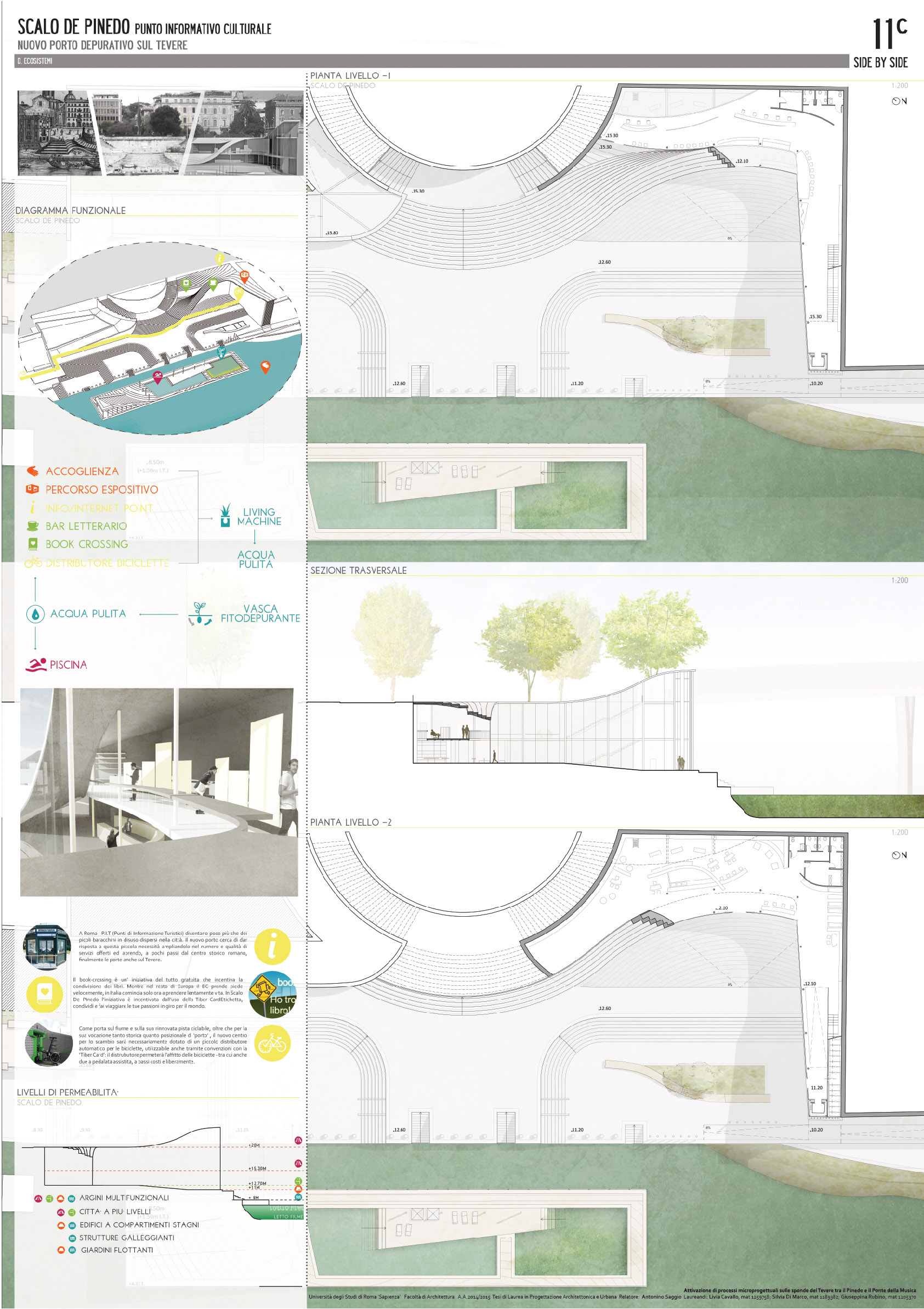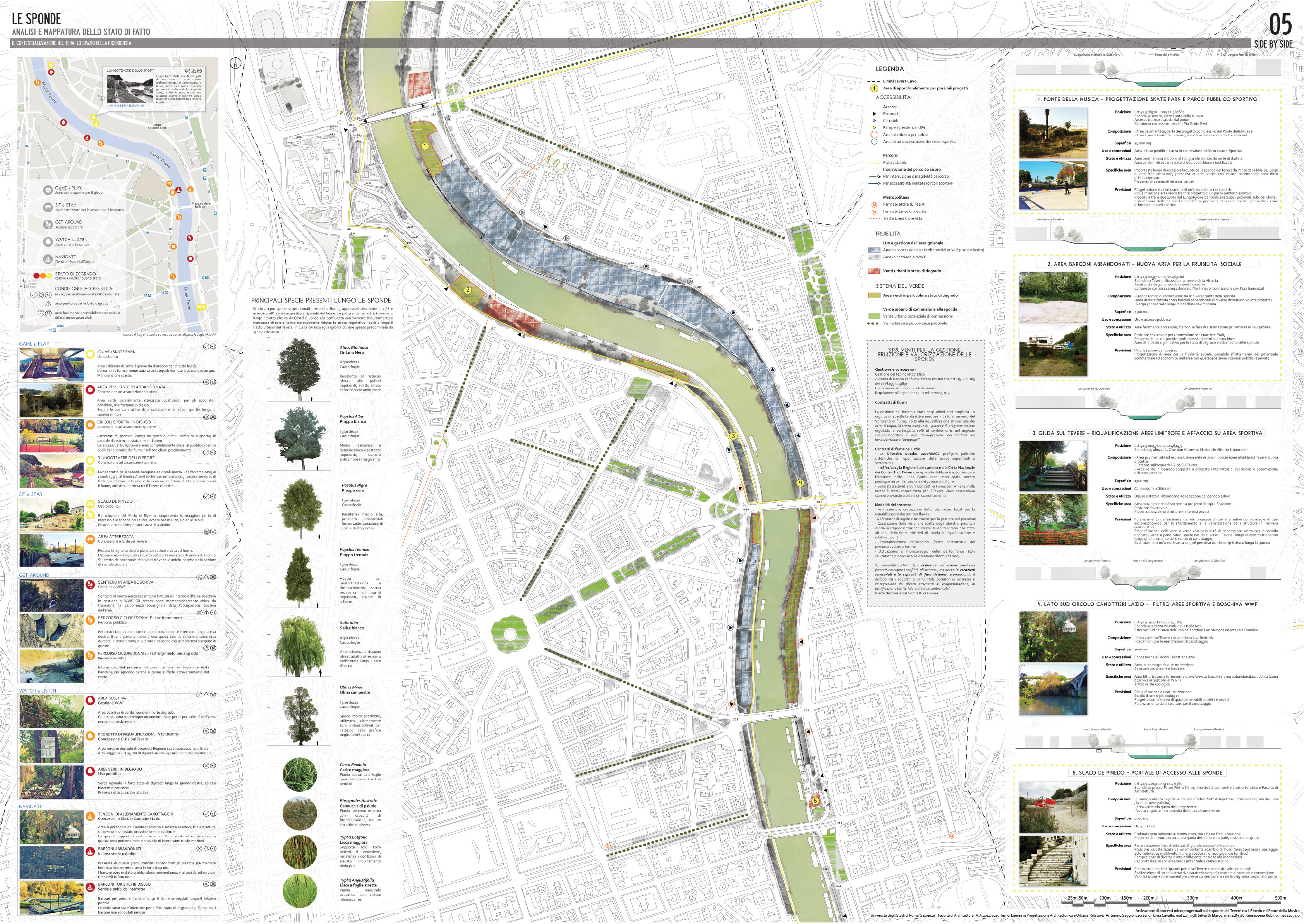 L’area di progetto, come si diceva tra il nuovo ponte della Musica e a lo Scalo de Pinedo, prevede come ambito di azione le sponde e le banchine del Tevere: le aree di interesse sono inserite in un master plan focalizzato su tre layer fondamentali: gli accessi dal Tevere e dalla città, la mobilità e le aree per micro progetti sostenibili sia dal punto di vista economico che sociale e ambientale. Il primo obiettivo è garantire l’accessibilità al Tevere ai cittadini, la relazione tra le due sponde e la valorizzazione ed ampliamento della mobilità alternativa, attraverso piste ciclabili e percorsi verdi. Nel master plan vengono individuate cinque aree di particolare interesse sulle quali verranno inseriti dei microprogetti con caratteri diversi: sportivo, relazionale di svago e informazione. Le aree con maggior pregnanza sono state oggetto di studo piu' dettagliato e ospiteranno i tre progetti principali caratterizzati da funzioni diverse in base alla vocazione dell’area: